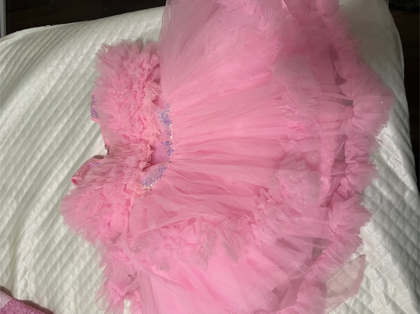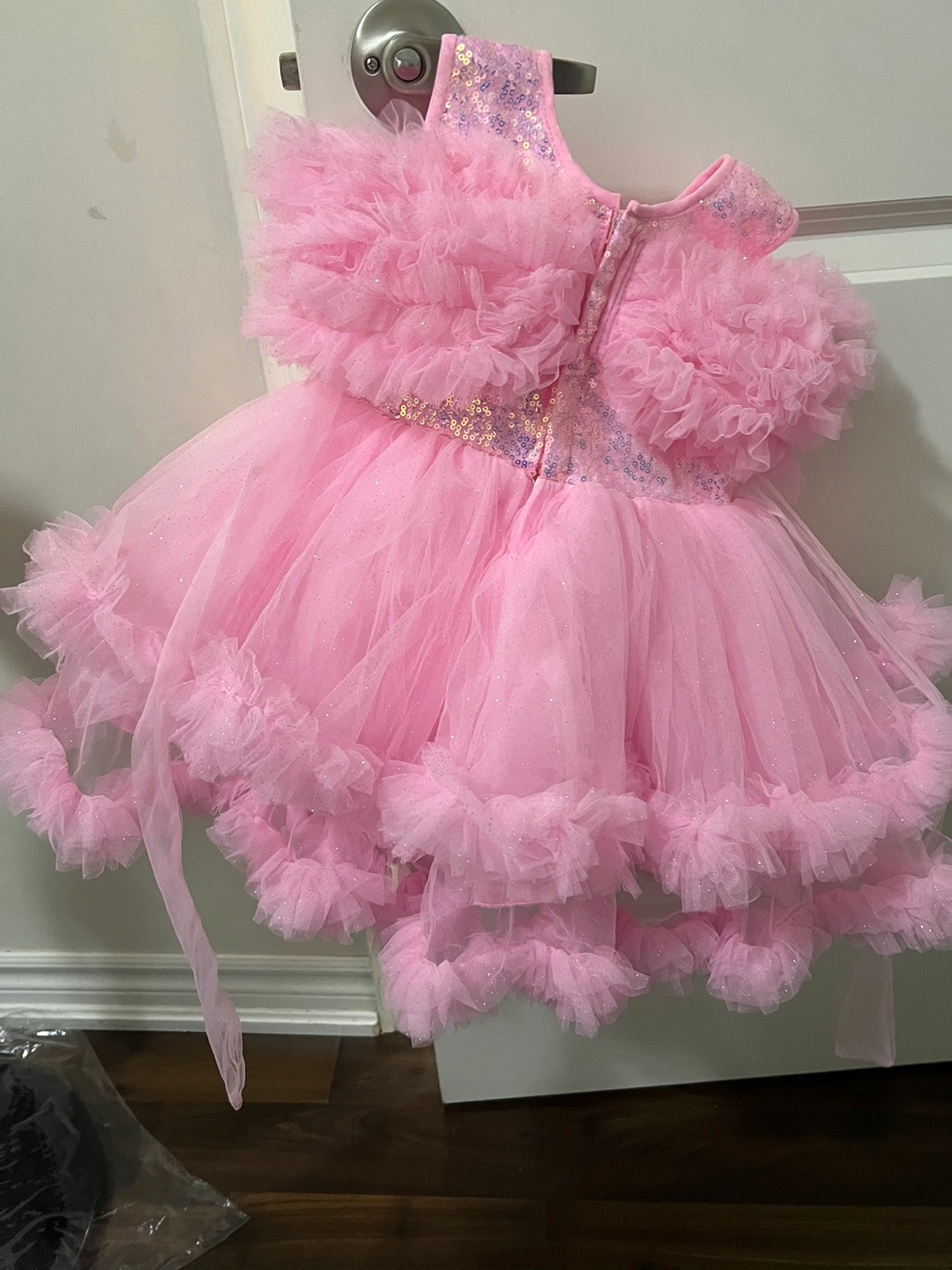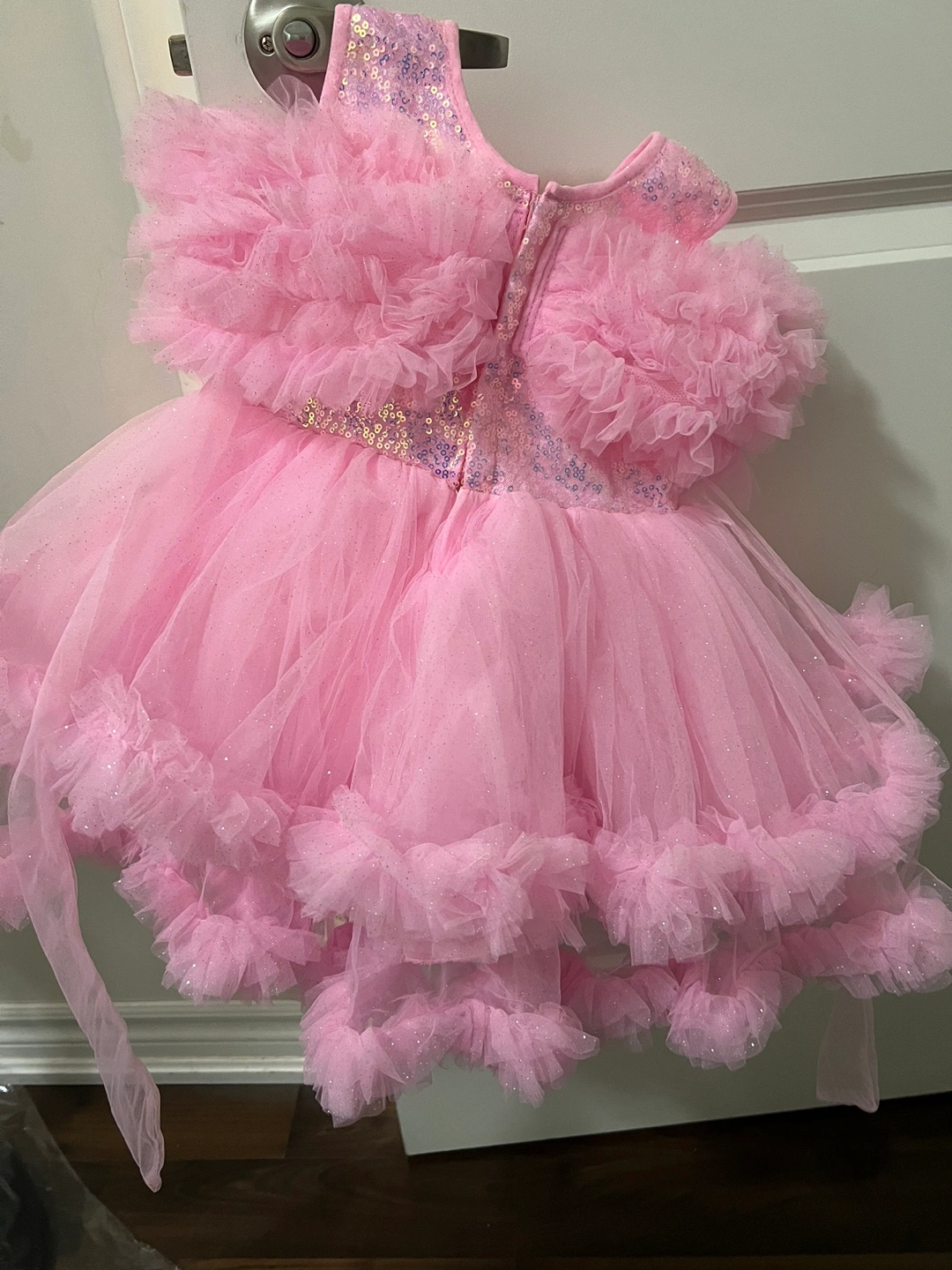10A beautiful pink dress. The dress has ruffles and a glittery look. The dress has a zipper in the back. It would be a joy to wear this dress to any event.