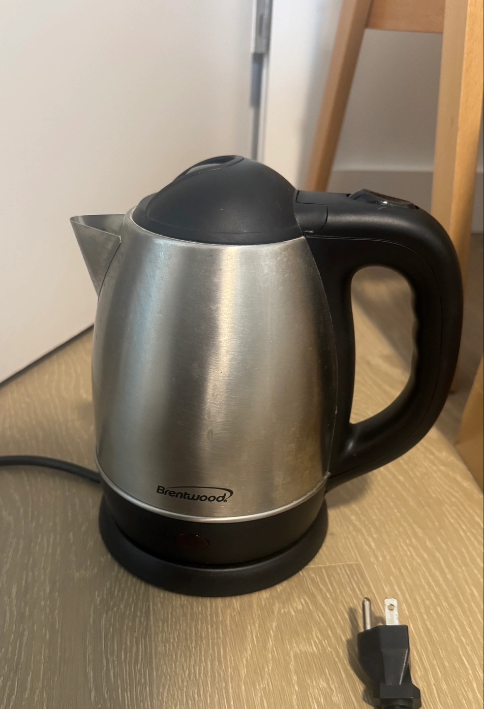 Stainless steel electric kettle. Features a black handle, lid, and base. Includes power cord. Perfect for making a soothing cup of tea or hot water.
