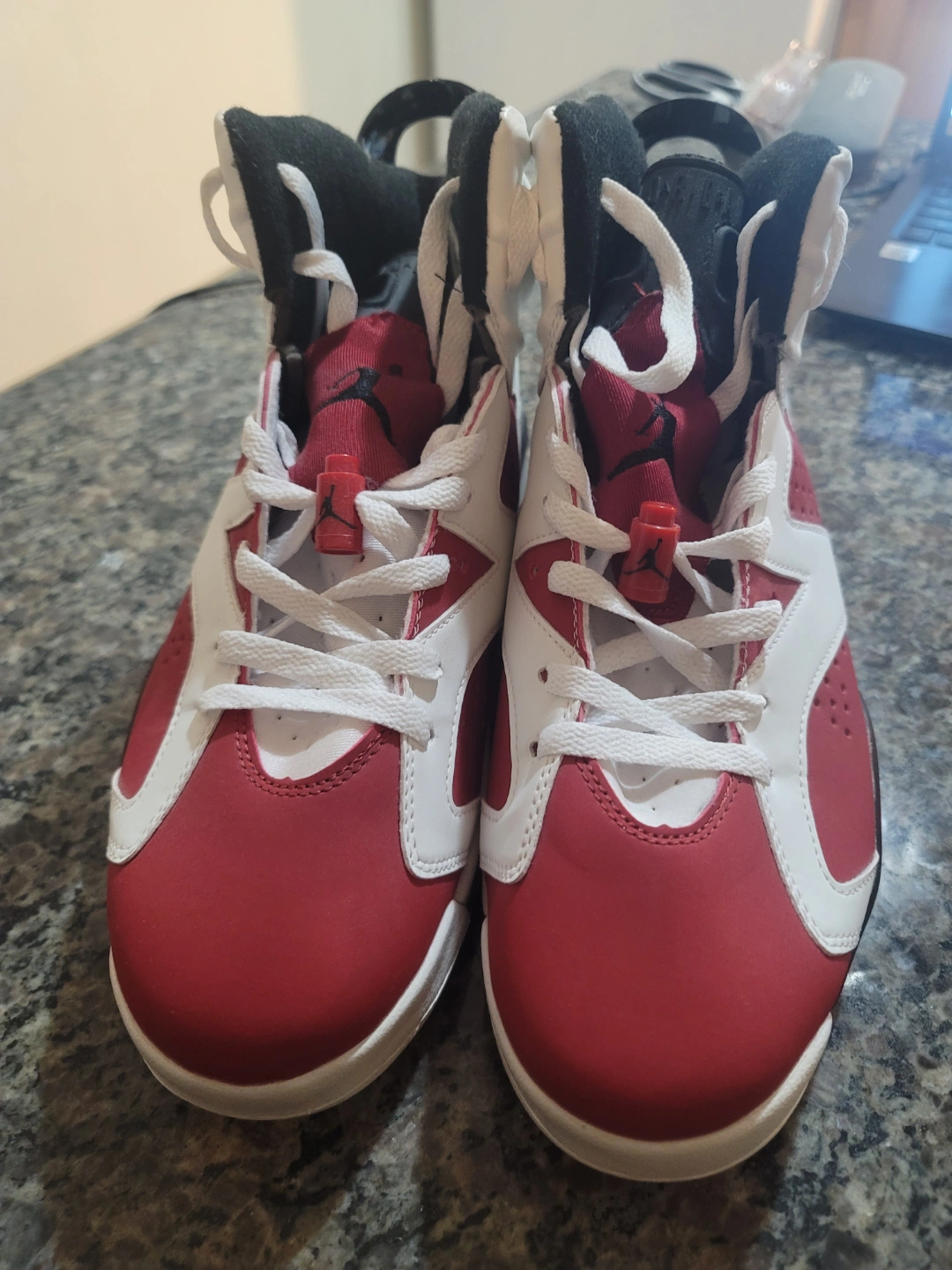 Red, white and black shoes. White laces and midsoles. Distinctive shoe design, with a red and white upper. Never worn! Absolutely like new! Comes with replacement box. Pick up only.