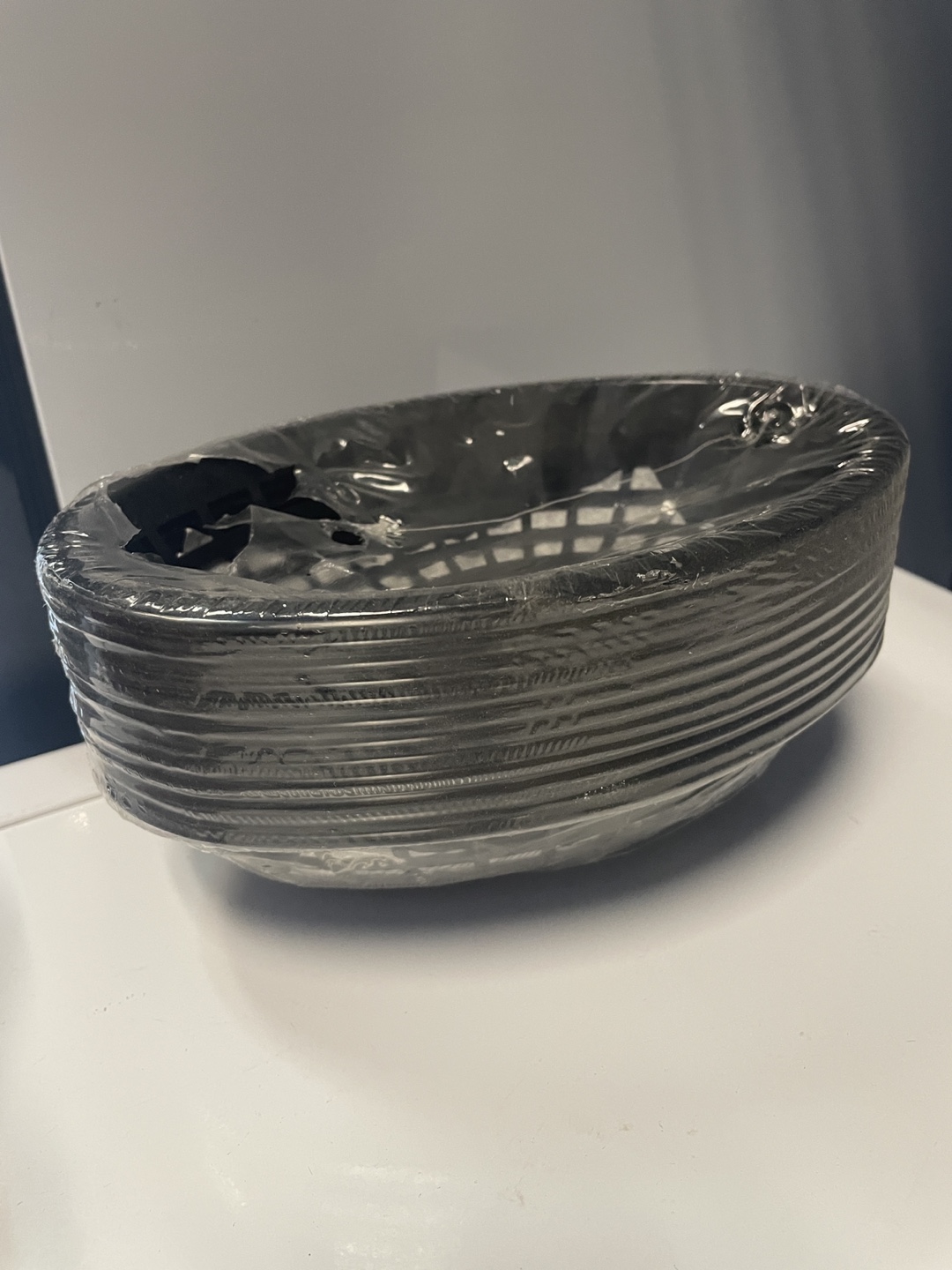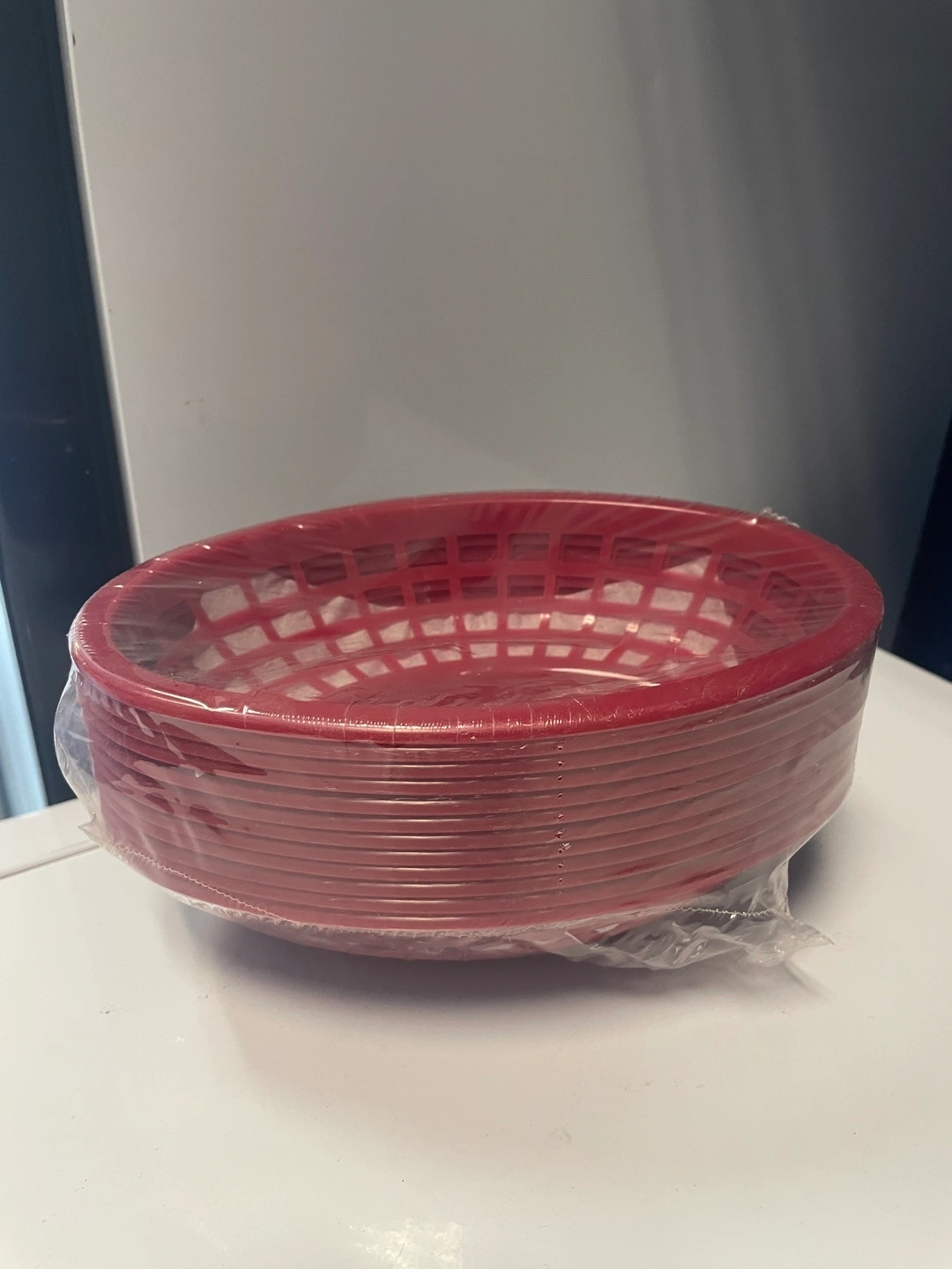 Red and black plastic food baskets. They are oval size. Packaged in plastic wrap. Use these baskets to serve your favourite snacks for your next relaxing movie night.