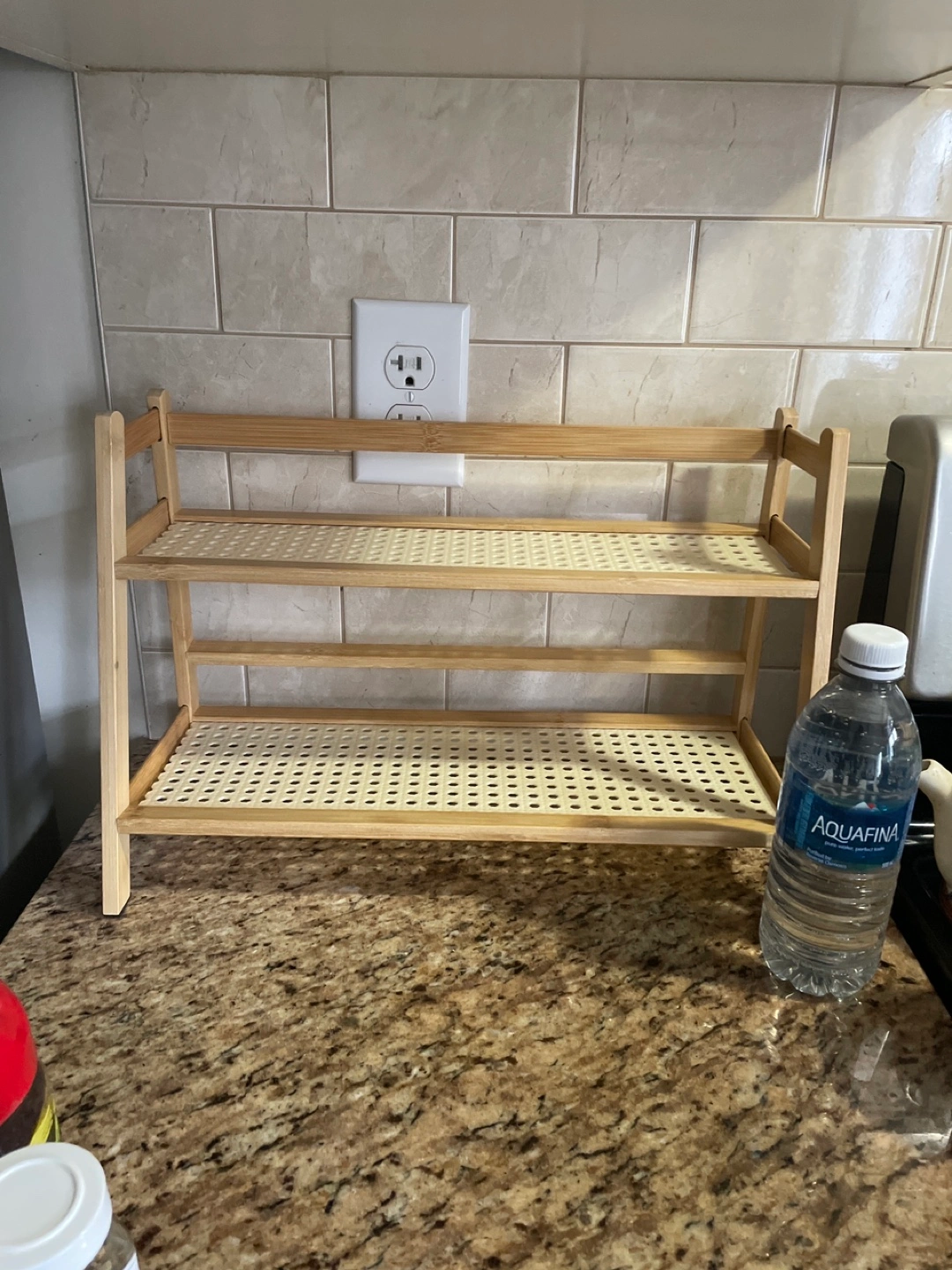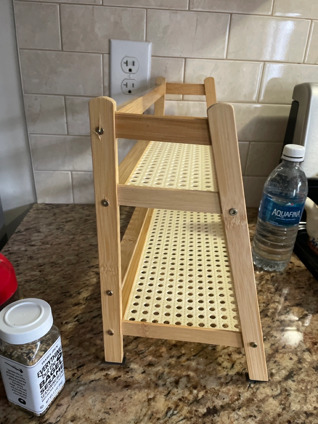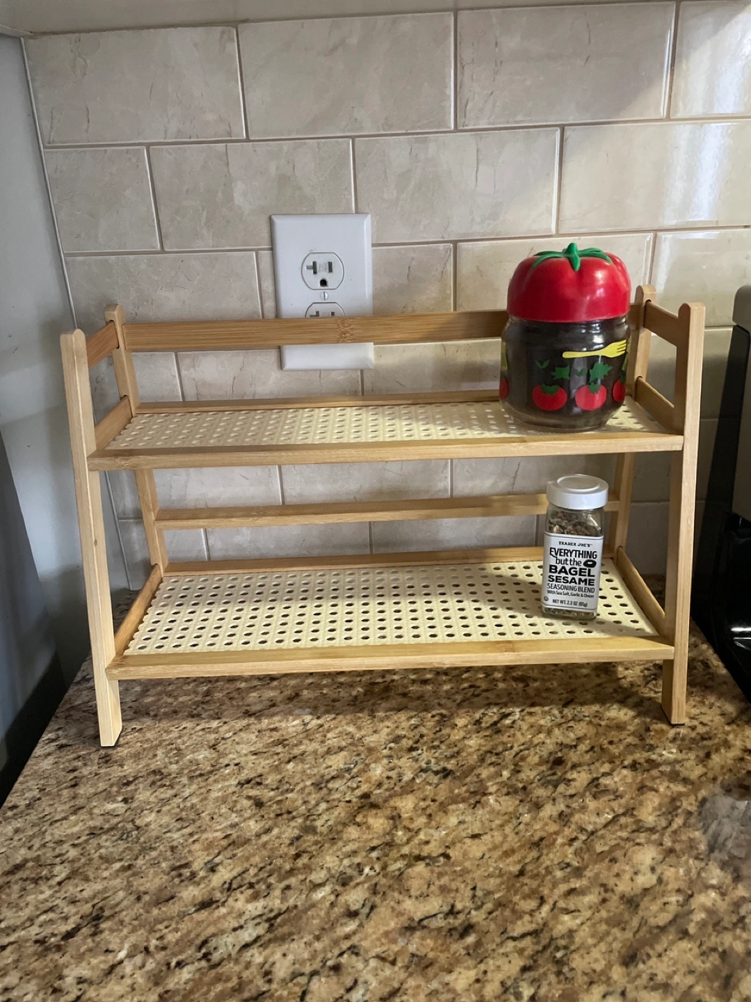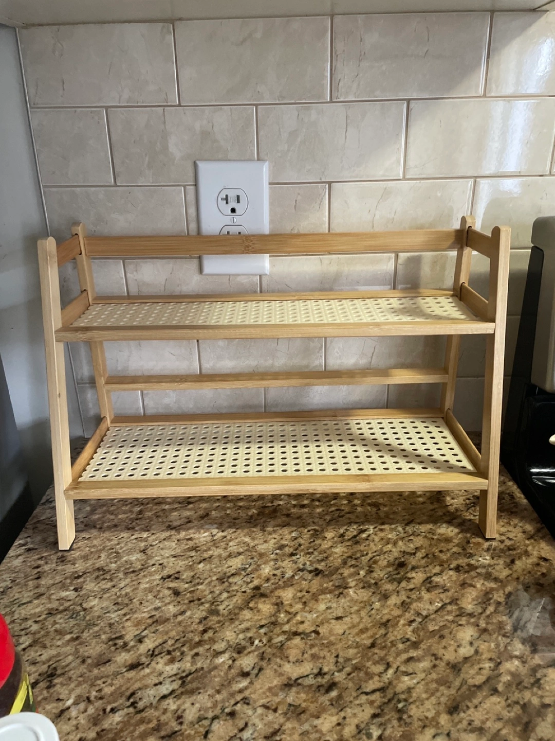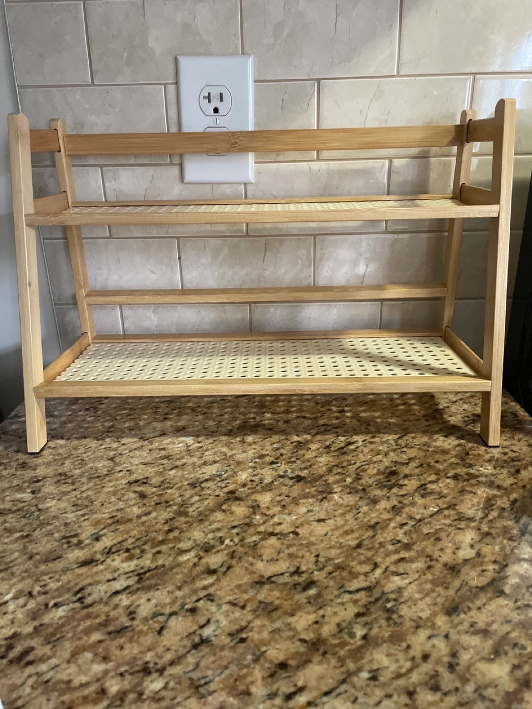 1000+Wooden shelf with two levels. Constructed of bamboo. The shelves have a woven design. Consider adding this shelf to your kitchen for a more organized space. 39cm*17.5cm*28.5cm