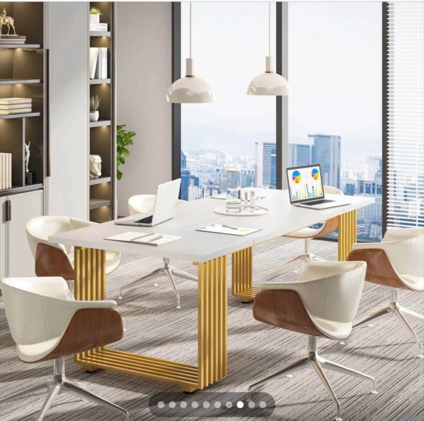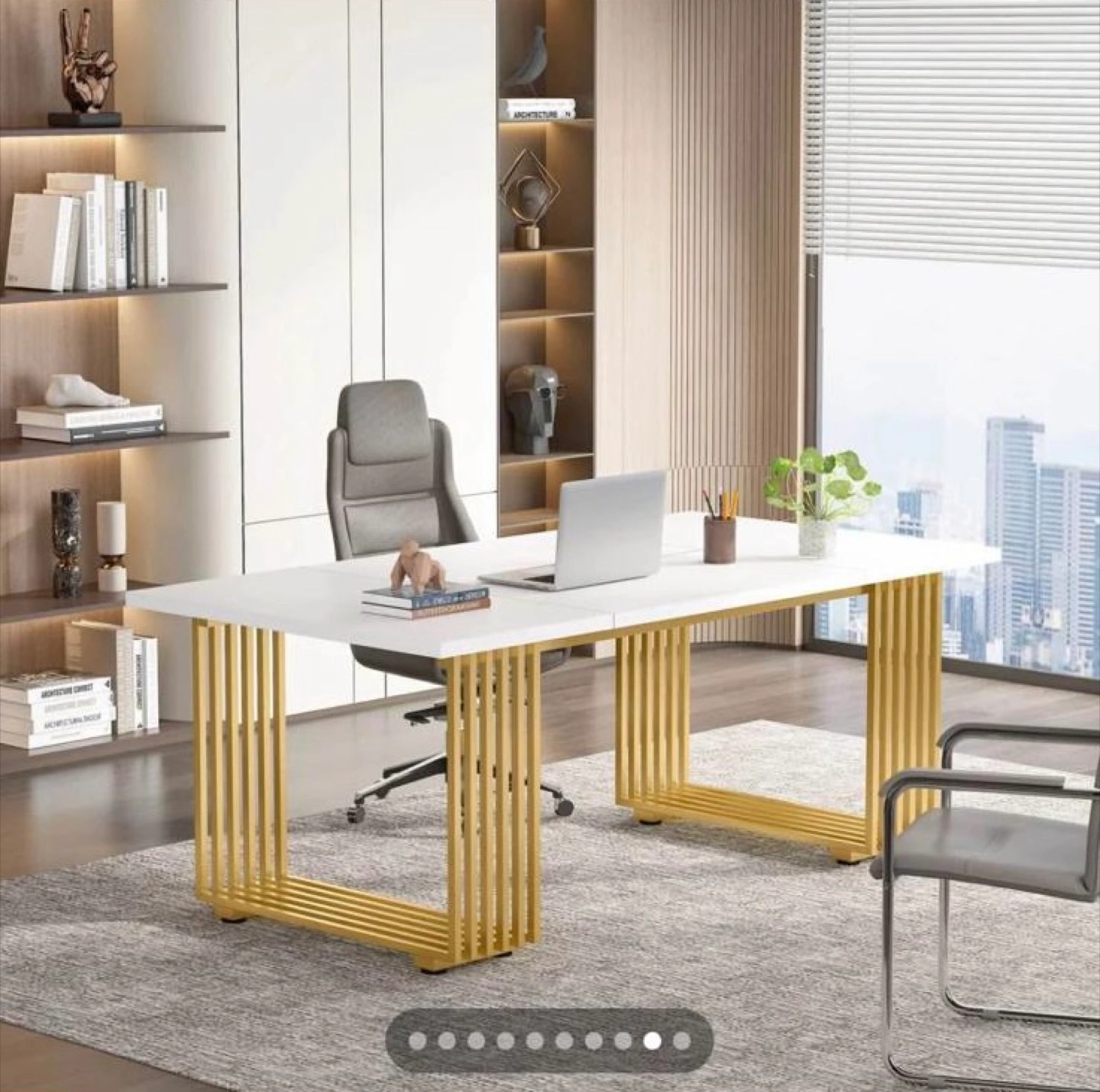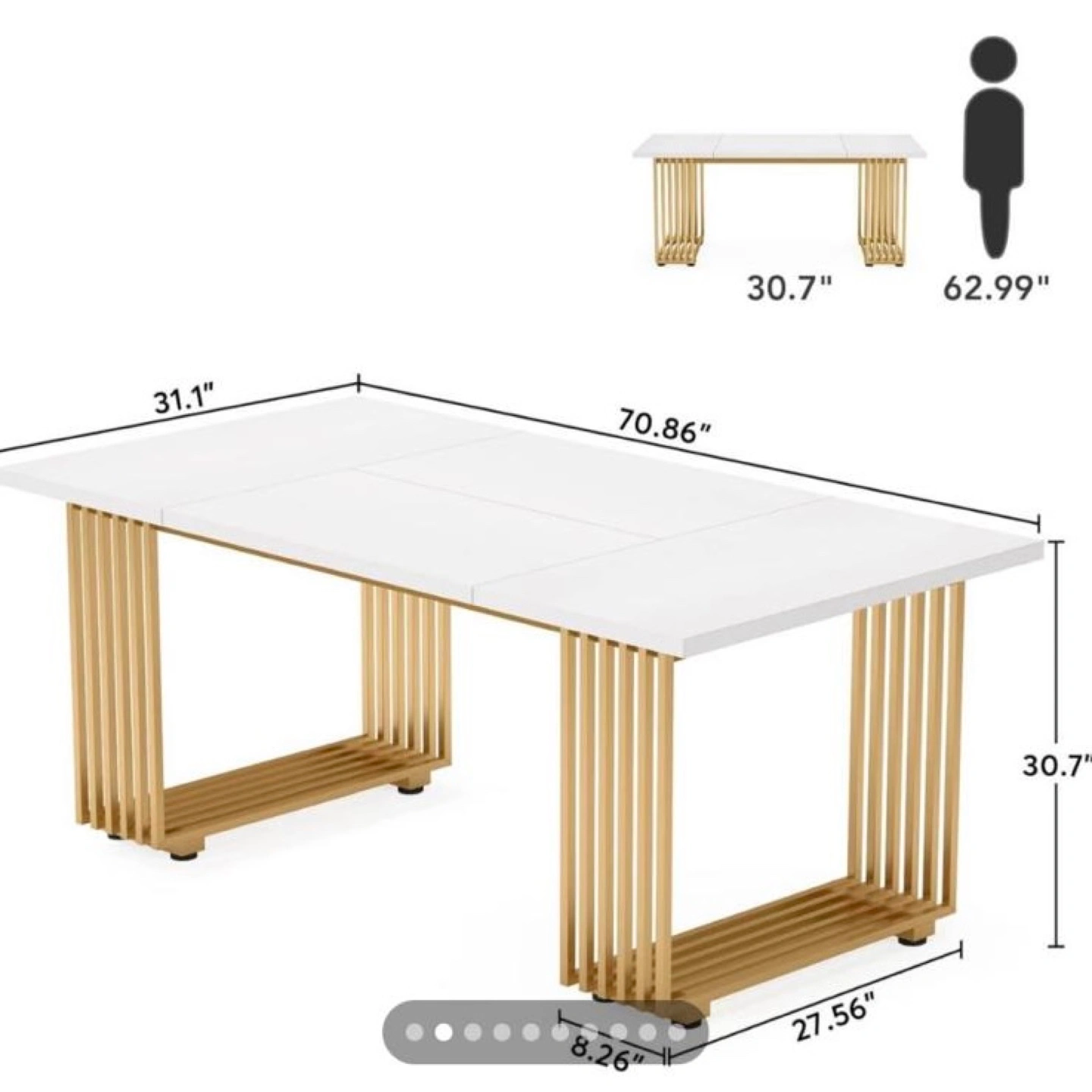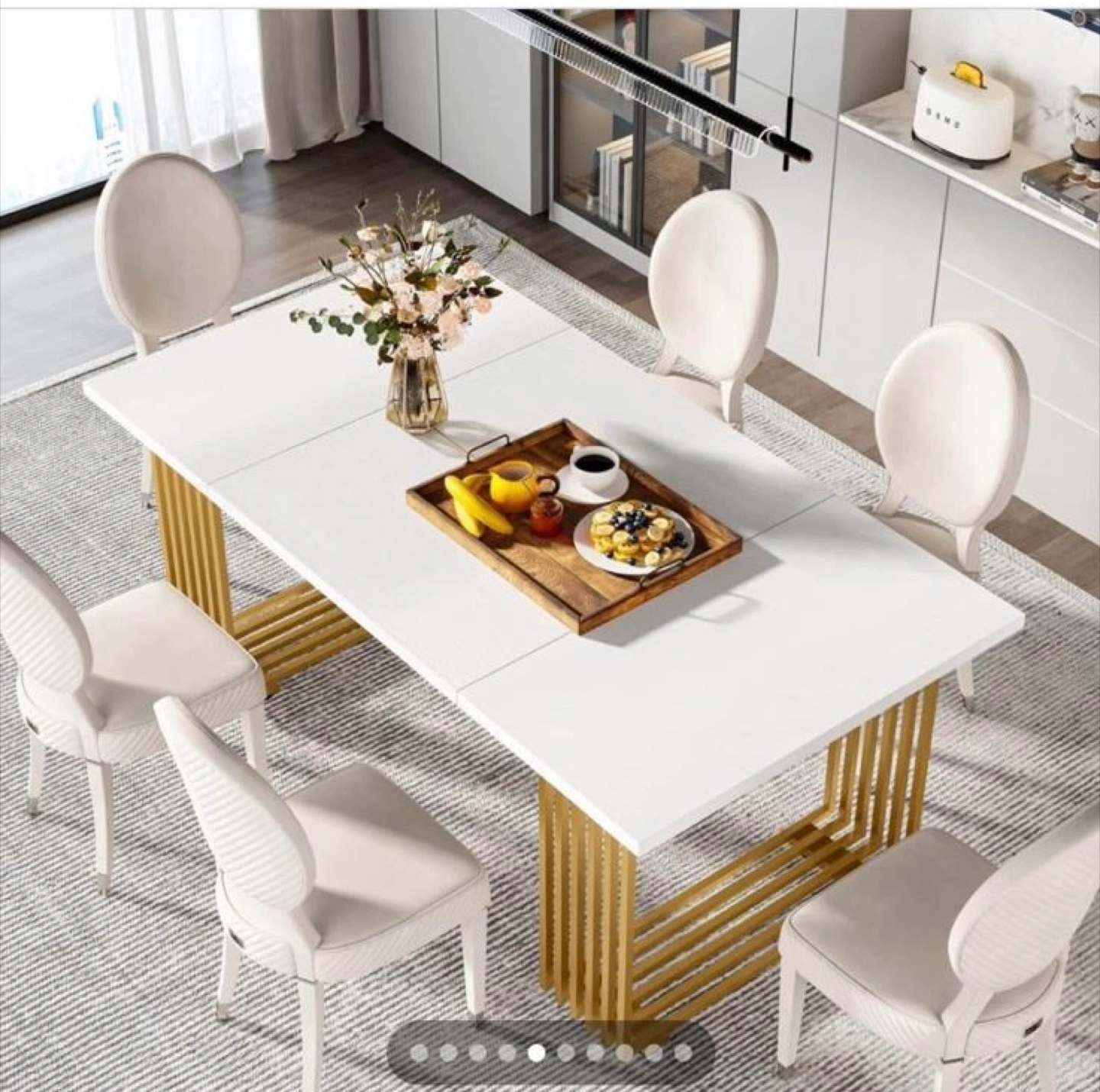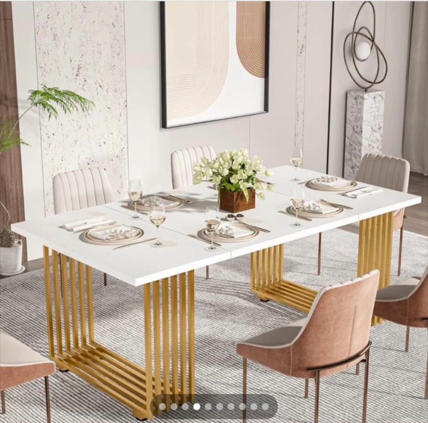 White dining table with gold legs. Rectangular shape. Modern design. Consider using it to bring together friends and family around a delightful meal.