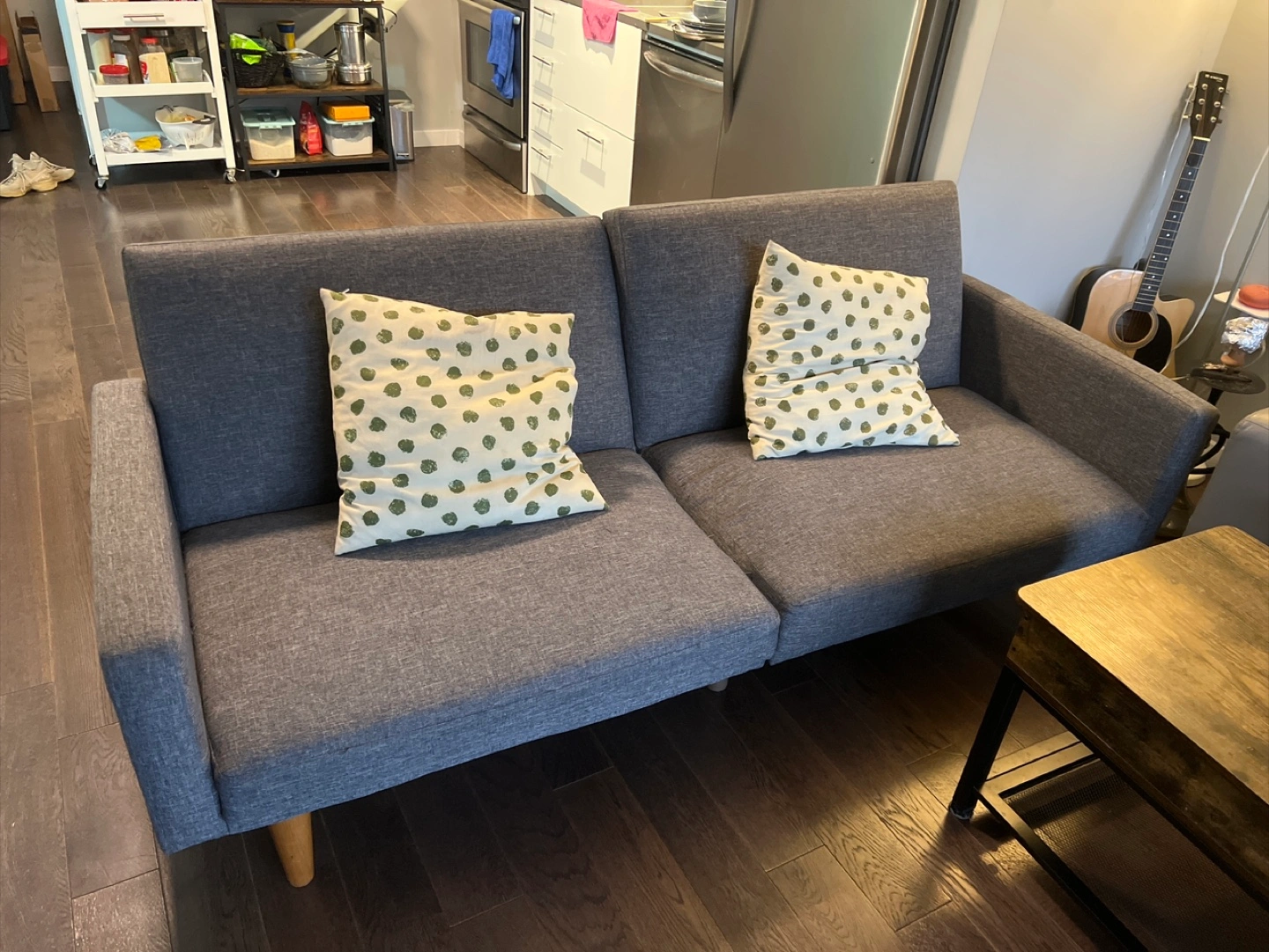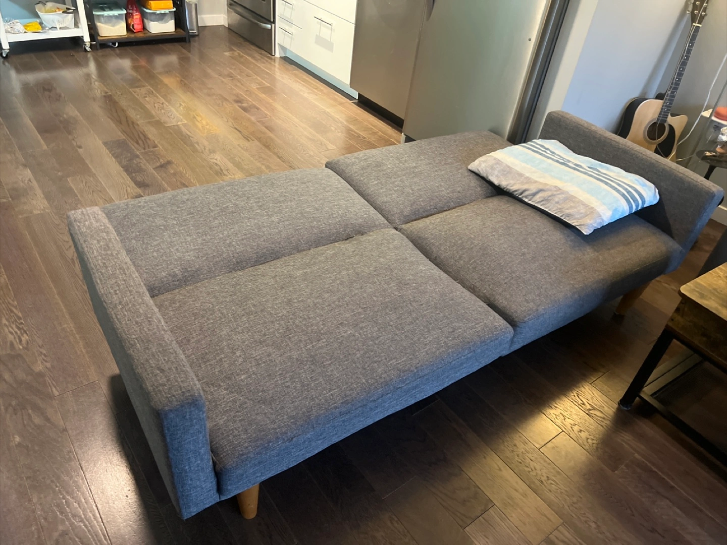 Gray fabric sofa. Can be used as a couch and a bed. A great addition to any room, making it ideal for a relaxing moment or a peaceful sleep.