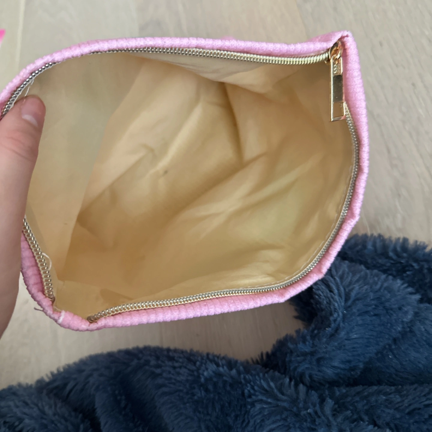 Pink pouch with a zip closure. Features a cherry print on the front. A useful item to organize your beauty products.