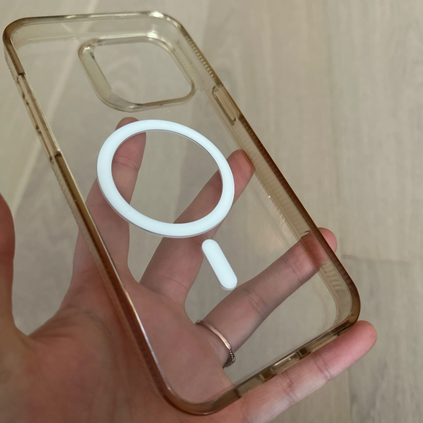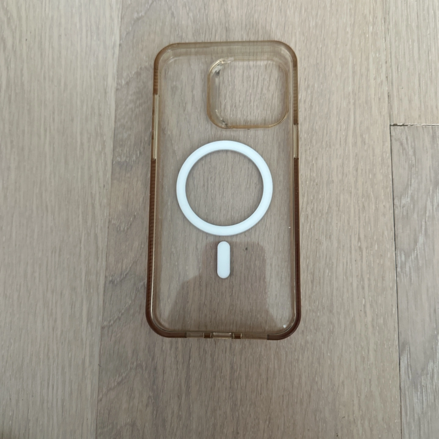 Clear phone case with a MagSafe design. It appears transparent with brown edging. You can feel more relaxed knowing your phone is protected. iPhone 15 pro max