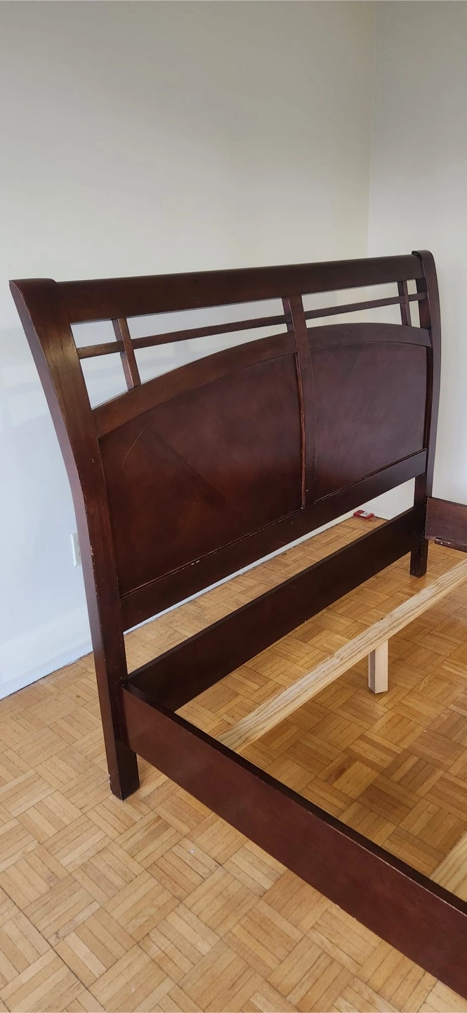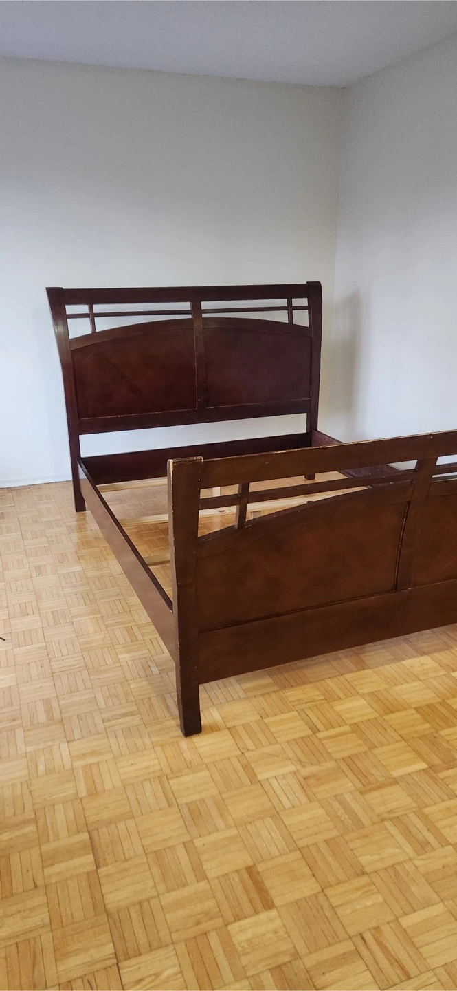 346PICK UP ONLY. If it’s not marked soled then it’s AVAILABLE! Solid Queen-size Dark wood bed frame. Includes a headboard, footboard, and side rails. NEEDS a BOXSPRING. A perfect addition to any bedroom, providing a peaceful resting spot.