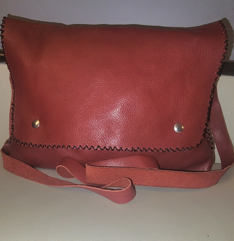 Made of leather. Features a long, adjustable strap. The flap secured by snaps. Carry it with you for a peaceful evening stroll.