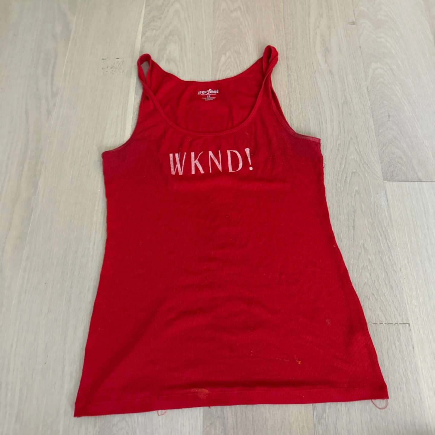 Bright red tank top. Features a printed graphic on the front. Great for casual wear when you want to feel relaxed.