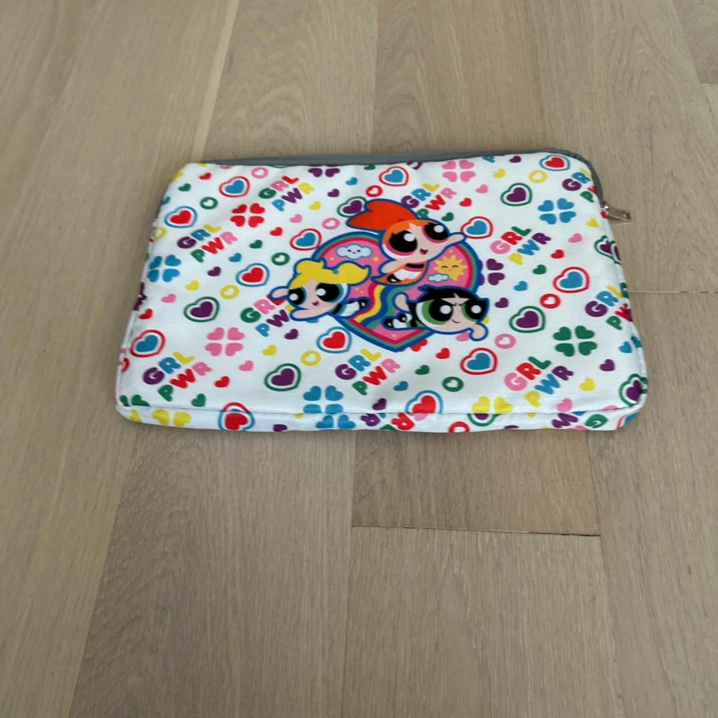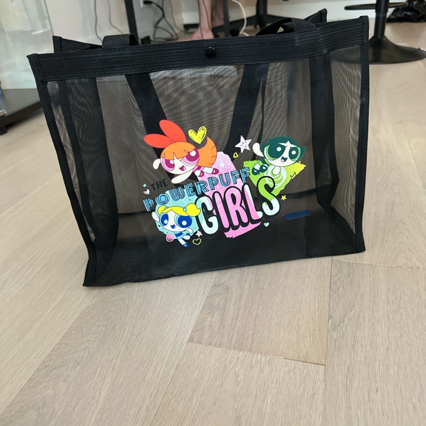 Mesh tote bag, featuring the Powerpuff Girls logo. The laptop sleeve has the Powerpuff Girls in the center. The sleeve also features repeating 'GRL PWR' text. You can easily carry your essentials with these items.