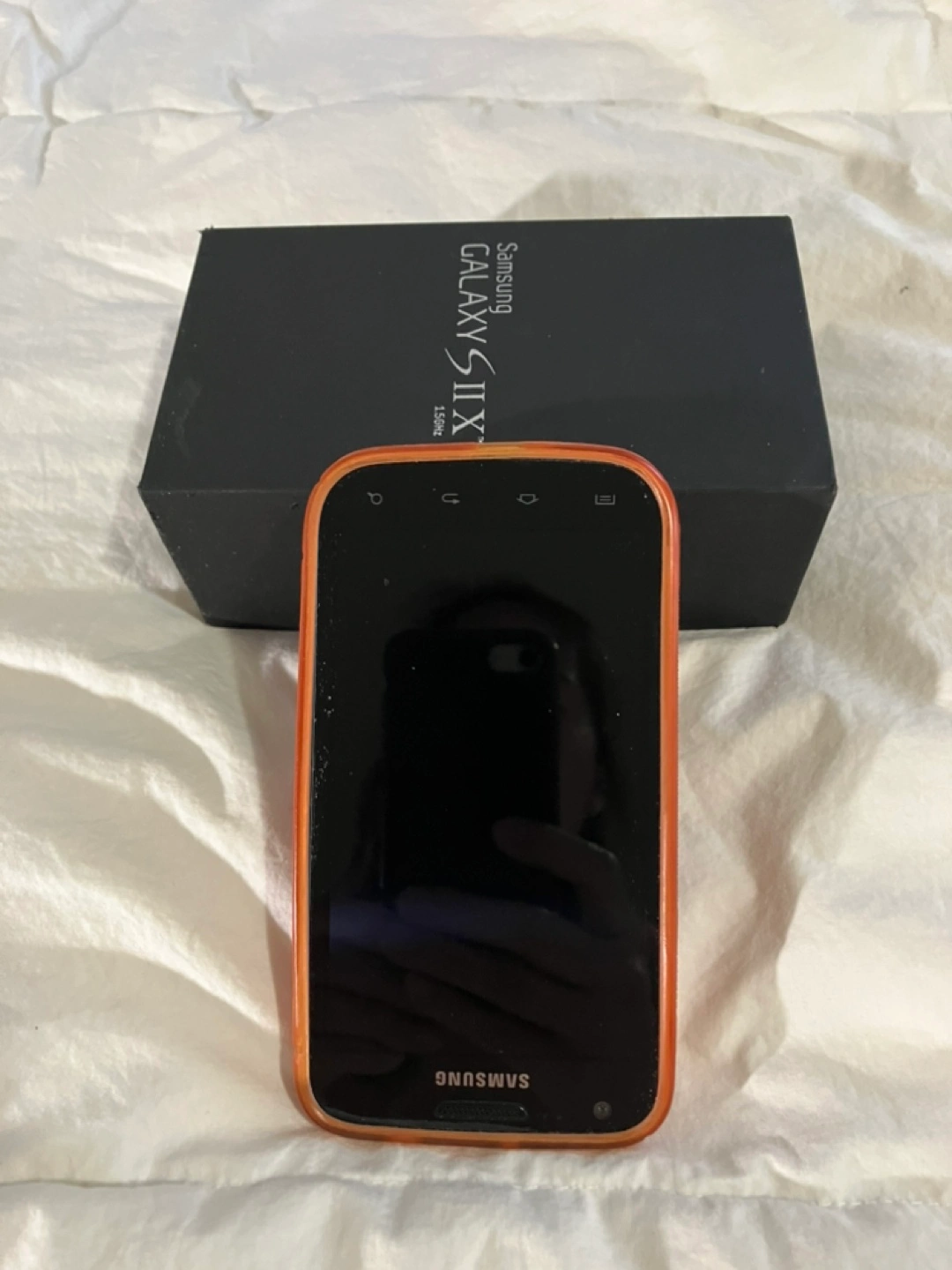 Appears to be a Samsung phone with a protective case. The phone is sitting in front of its original box, both resting on wrinkled fabric. It can be a great way to stay connected with friends and family.