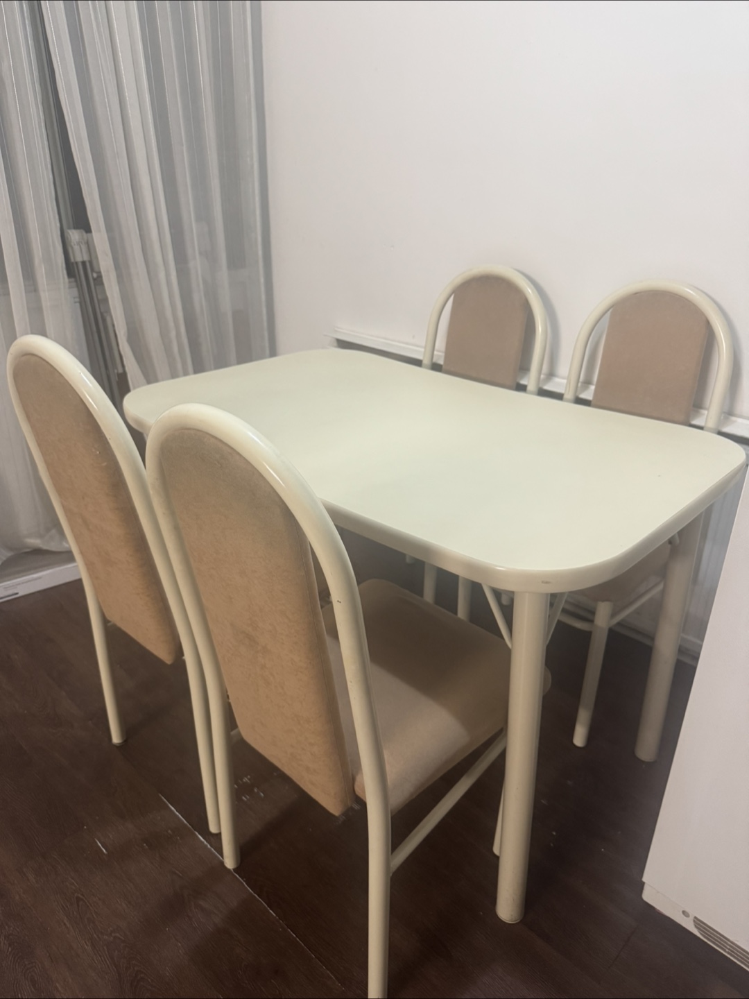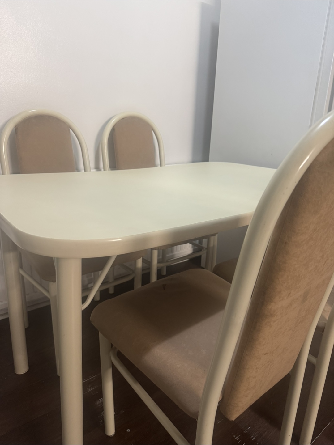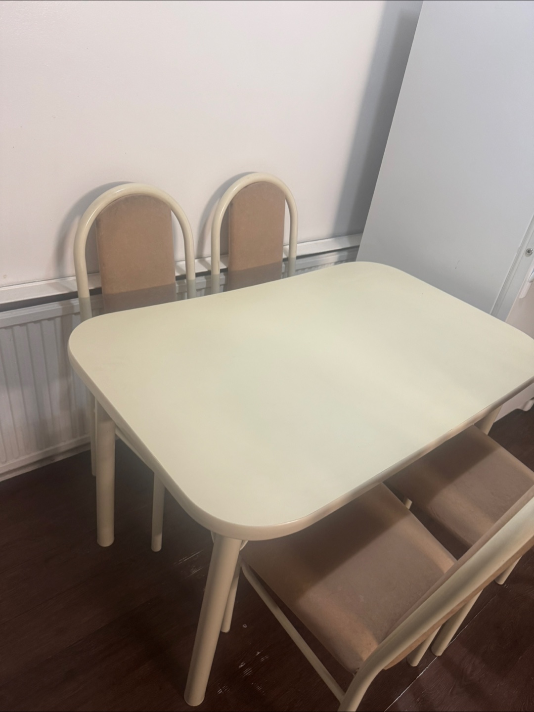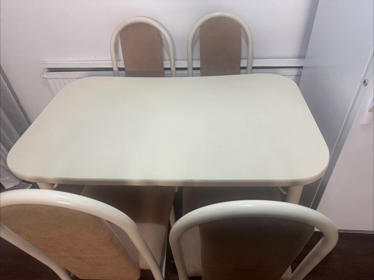 Dining table with four chairs. Table with a cream finish. Chairs with cream frames and neutral fabric seats and backs. In okay condition, chair a bit worn out but can do.