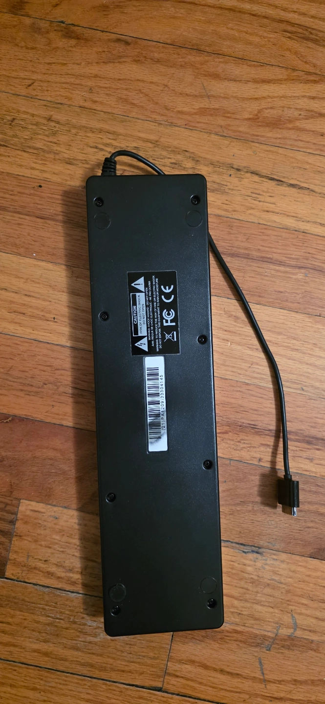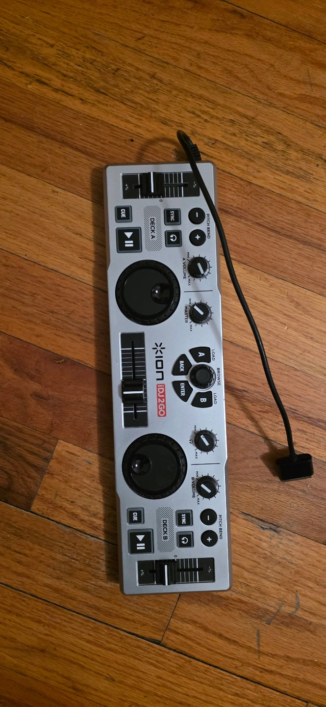 23Silver and black DJ controller. Features knobs, buttons, and faders. Includes a connecting cable. A great item for mixing music and creating a relaxing atmosphere.
