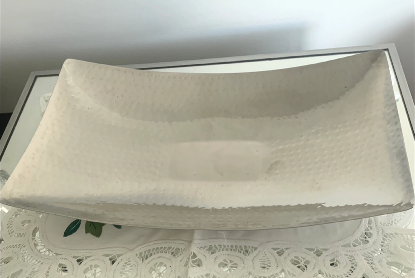 Silver-toned serving dish. Rectangular shape. Curved sides. Multifunctional uses.
