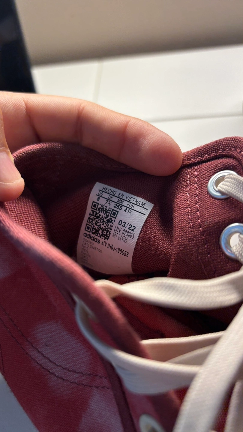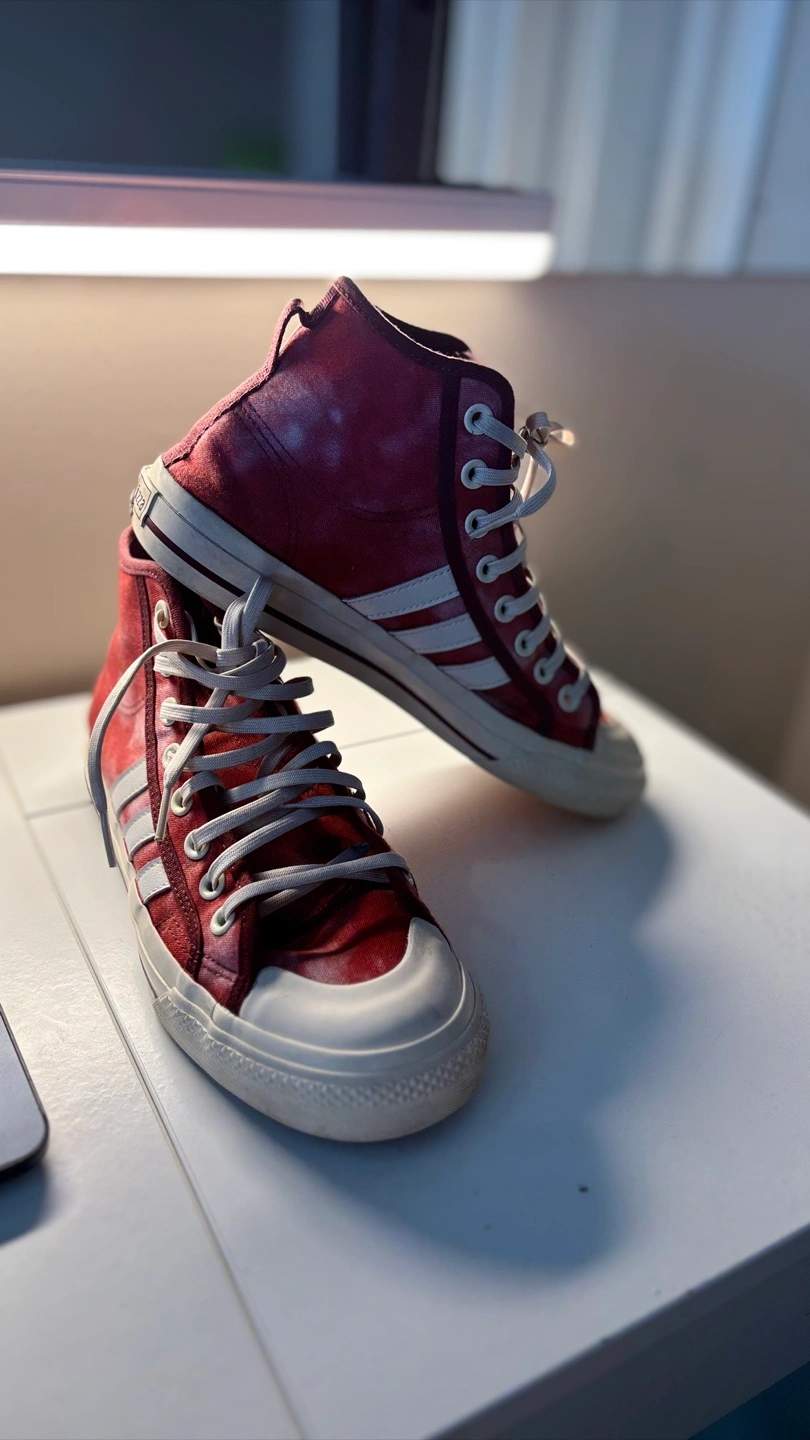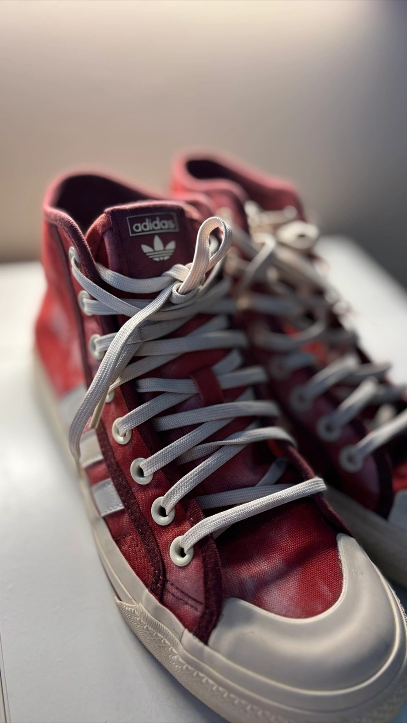 68High-top sneakers. Deep red and white colourway. Features laces. The sneakers can be worn for a nice day out.