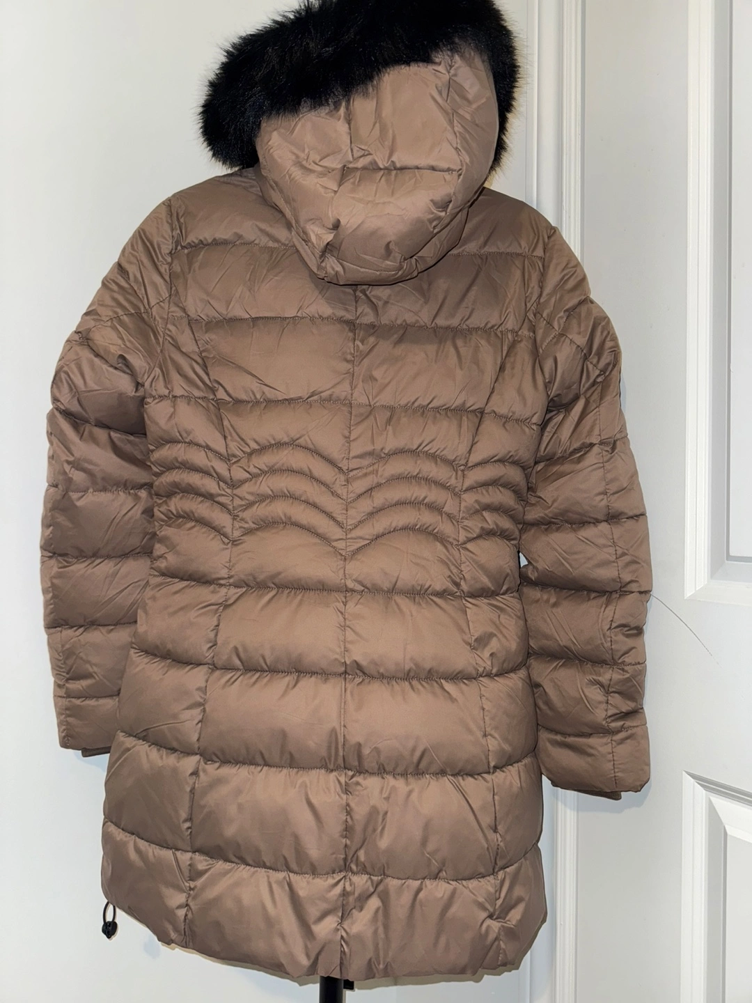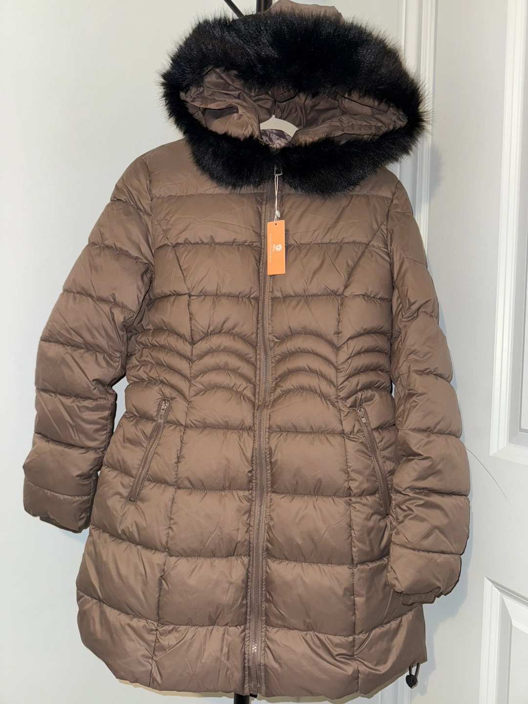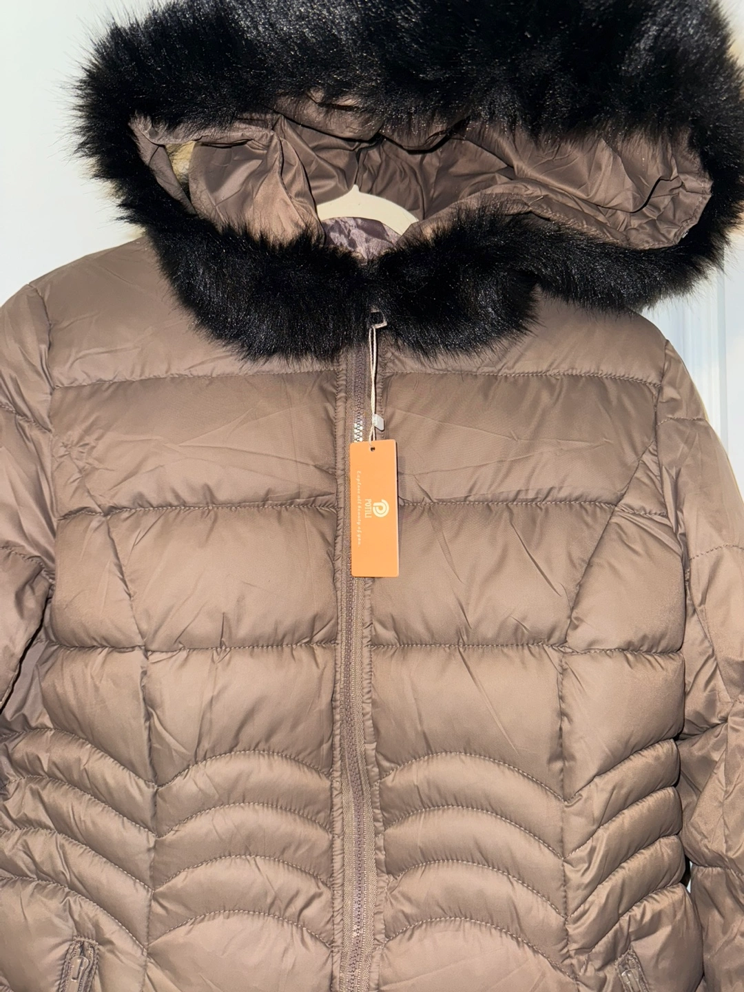 261Brown winter coat. Features a hood with faux fur trim. Contains a zipper closure. Enjoy feeling warm and cozy on cold days while wearing this coat. Pick up Oshawa and Etobicoke