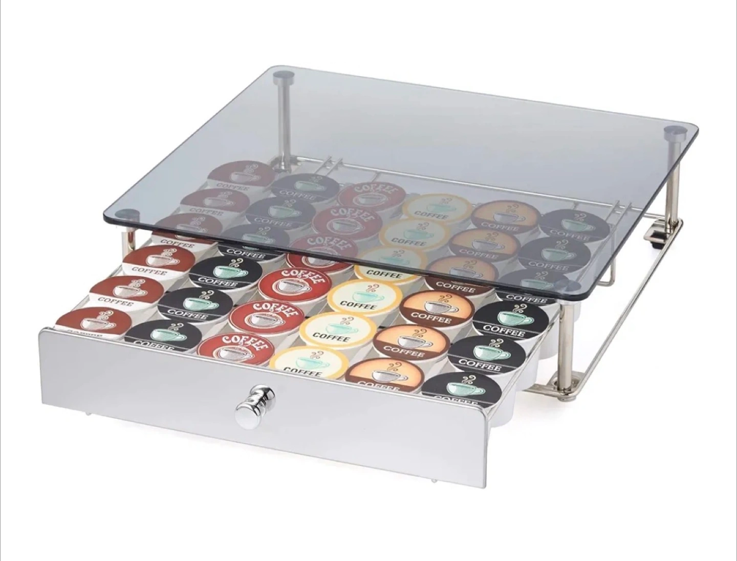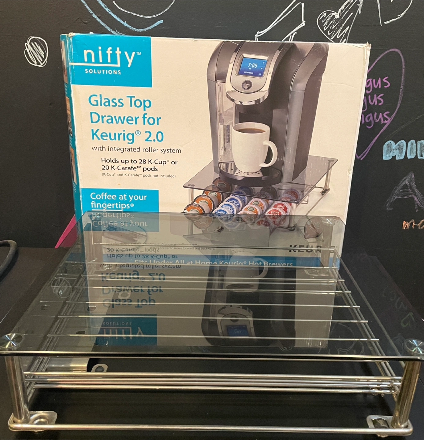42A glass top drawer. With an integrated roller system. Designed to hold K-Cup or K-Carafe pods. This drawer makes a great addition to any kitchen for easy access to your favourite coffee.
