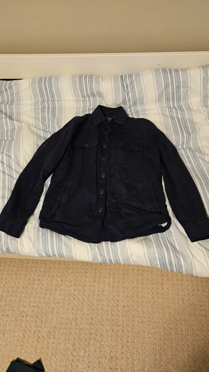 77Navy-blue shirt jacket. Button closure. Features buttons on the front and on the pockets. Great for layering on those cooler days, offering both style and comfort.