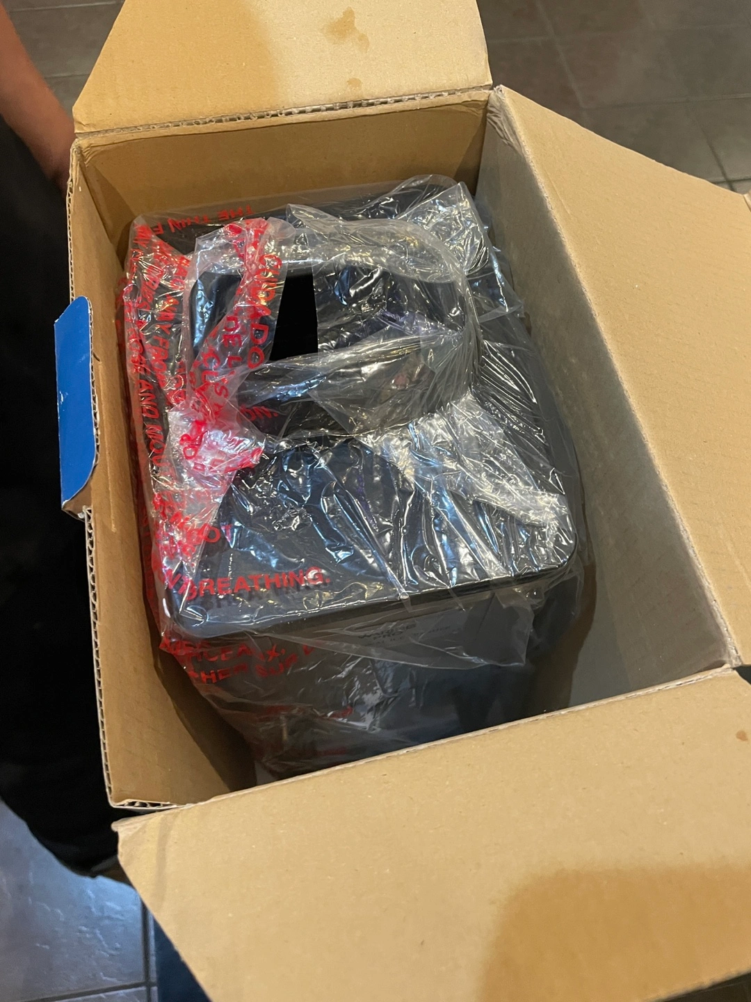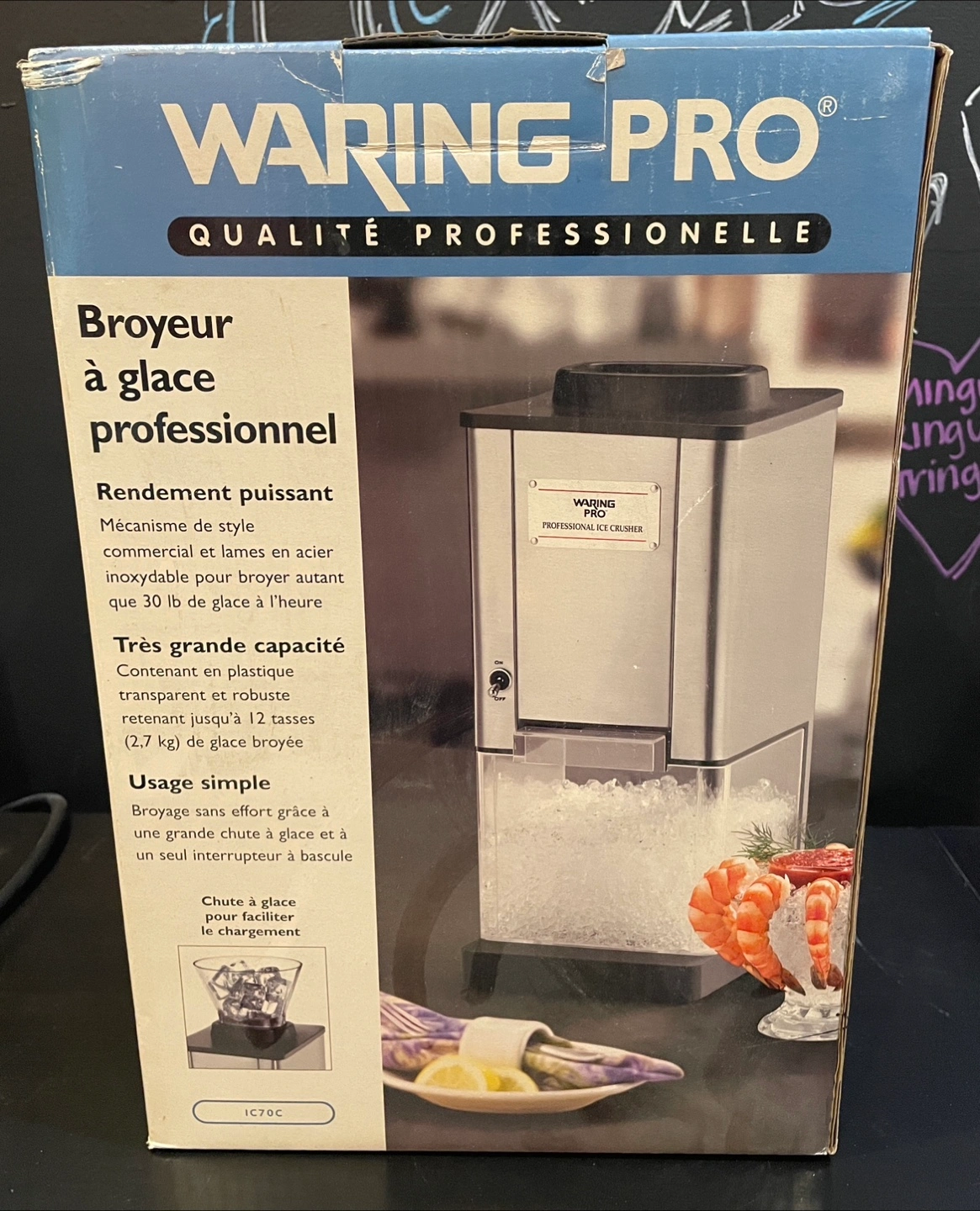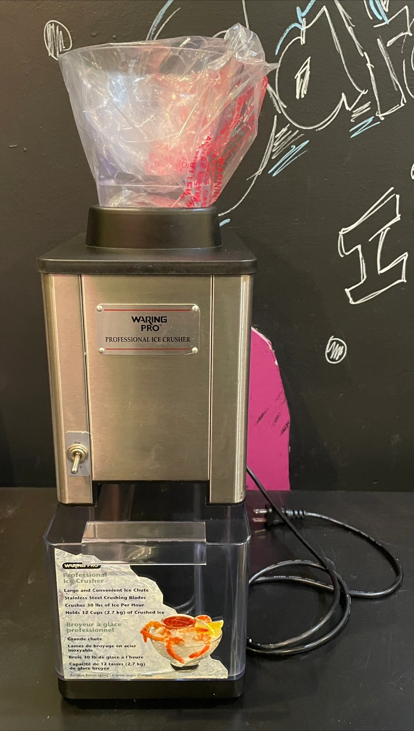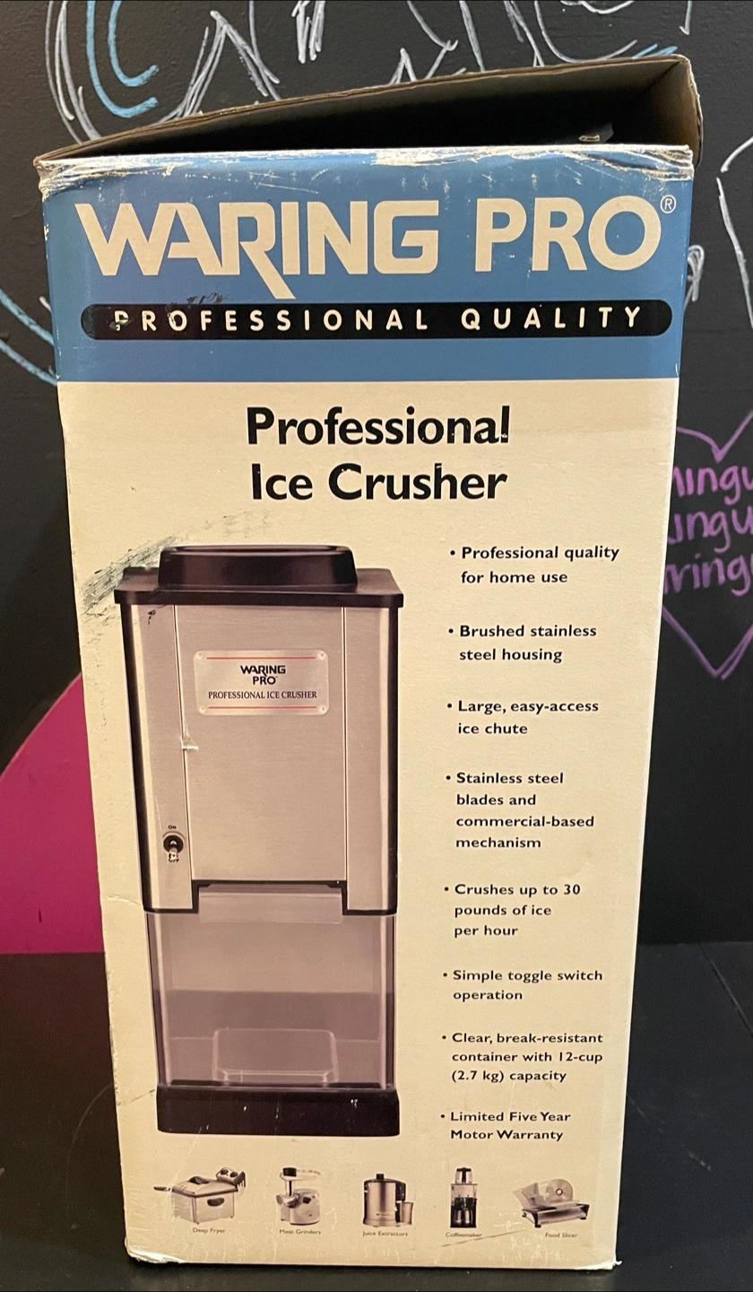 42Ice crusher in its original packaging. Features a stainless steel exterior. Includes a collection container and power cord. Using the ice crusher is a great way to unwind and enjoy some refreshments.