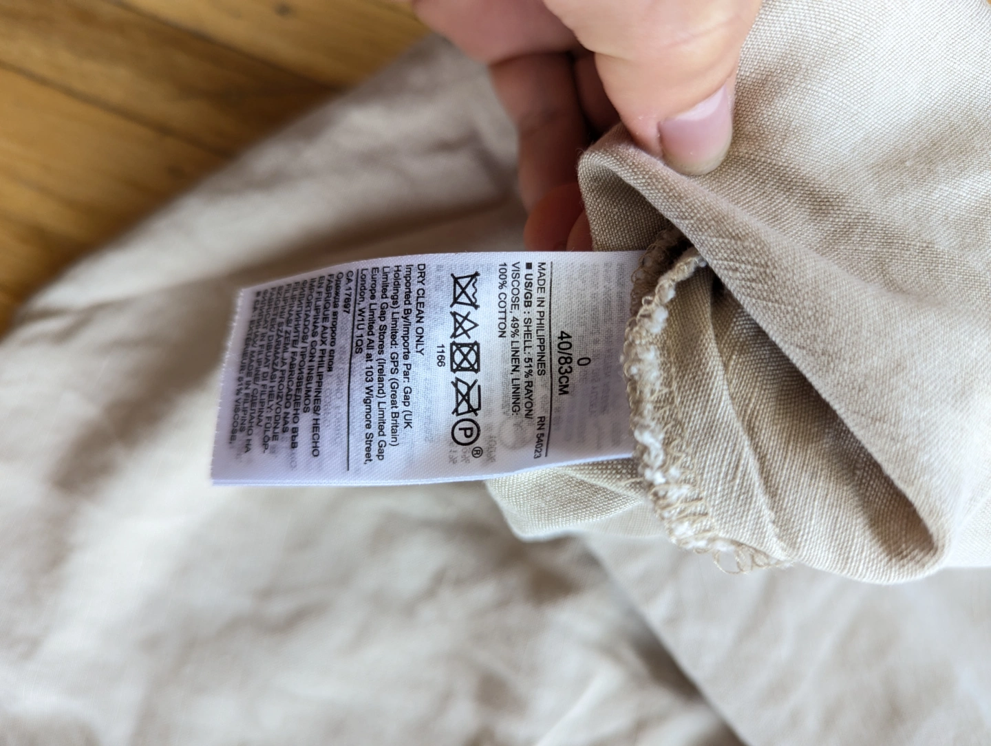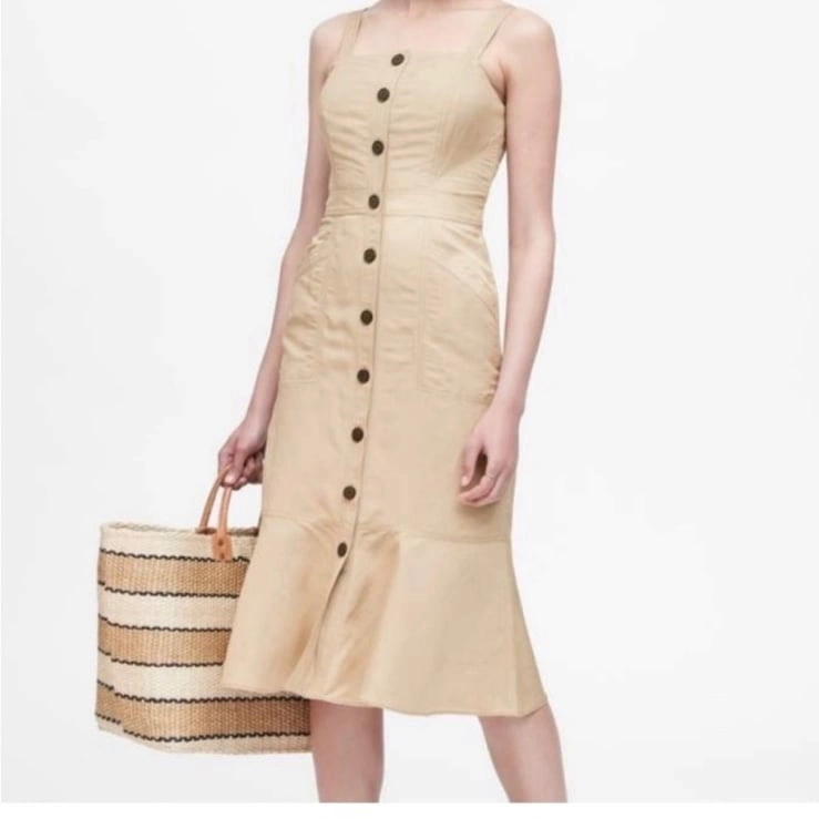 Light tan dress. Sleeveless style with button up closure. It has a flared hem. 49% linen.