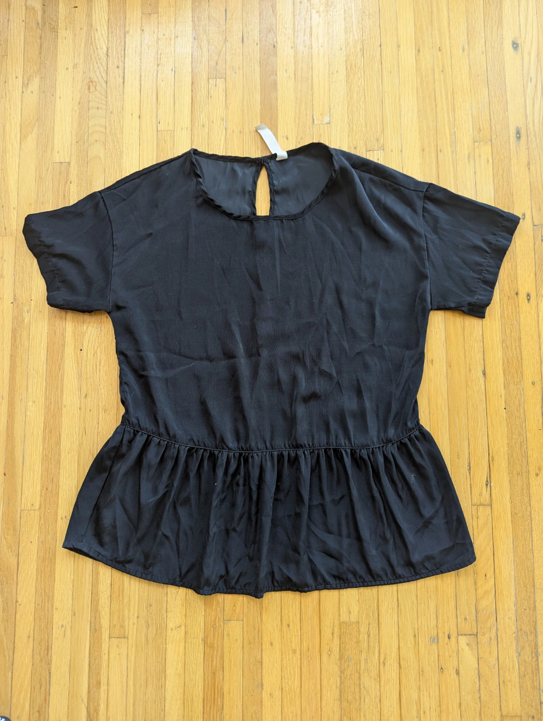 Black short-sleeve blouse with a gathered ruffled hem. Round neckline and keyhole button closure at the back. Lightweight polyester fabric semi-satin finish.