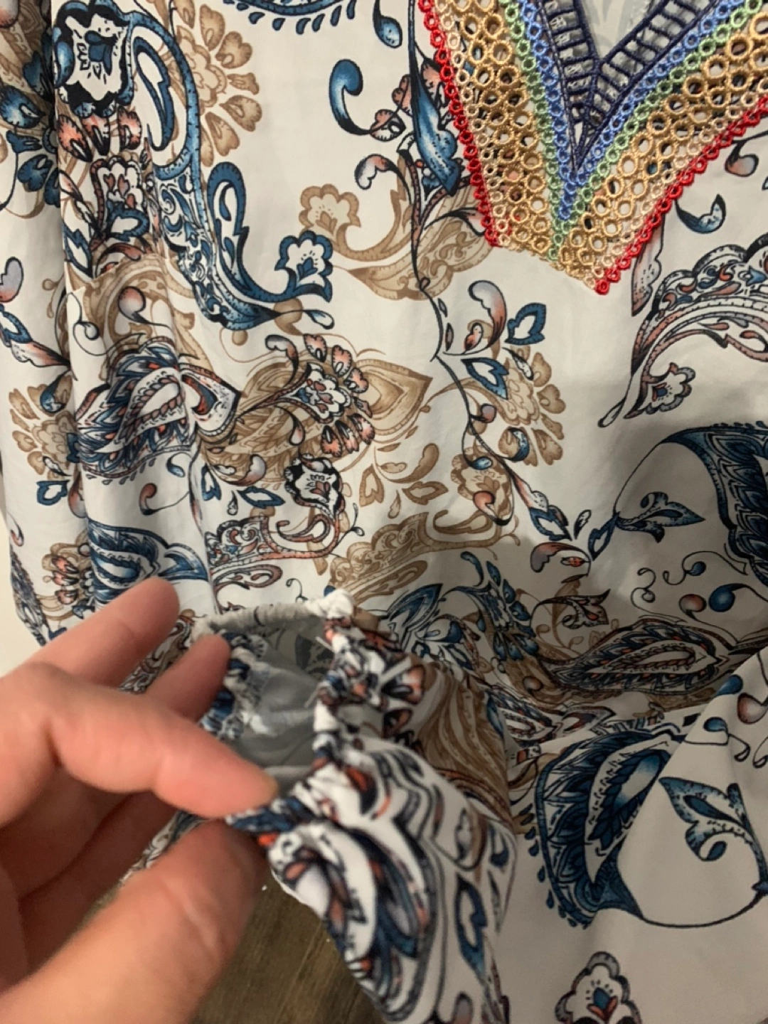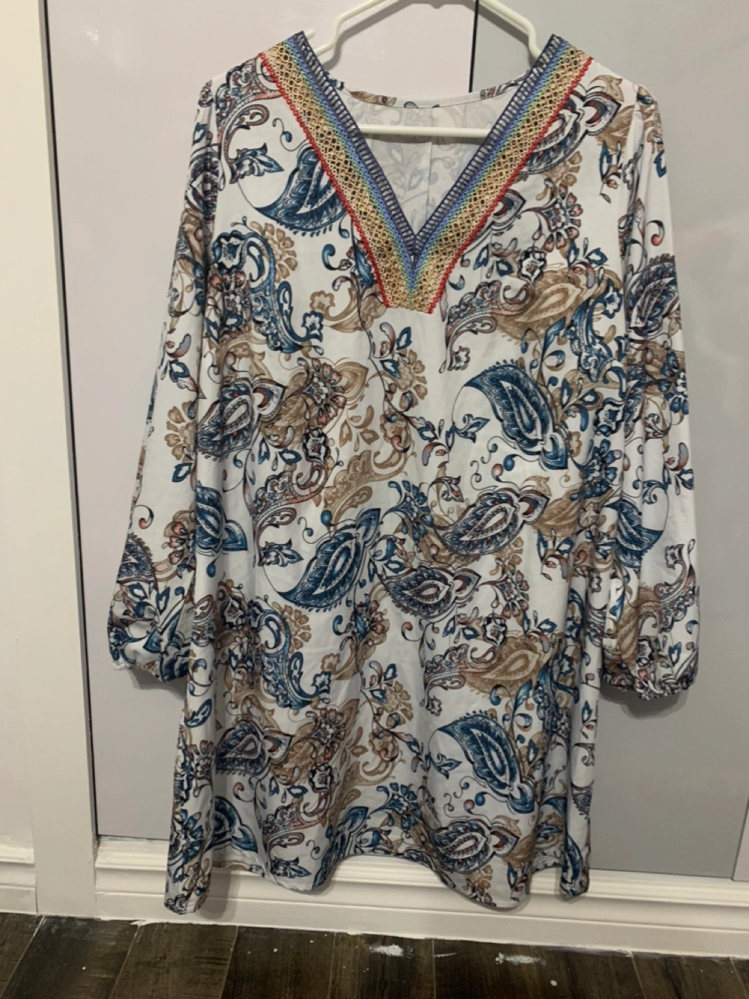 A bohemian-style top. Features a paisley pattern. Long sleeves and a v-neckline. Could be great for a relaxed day at home.