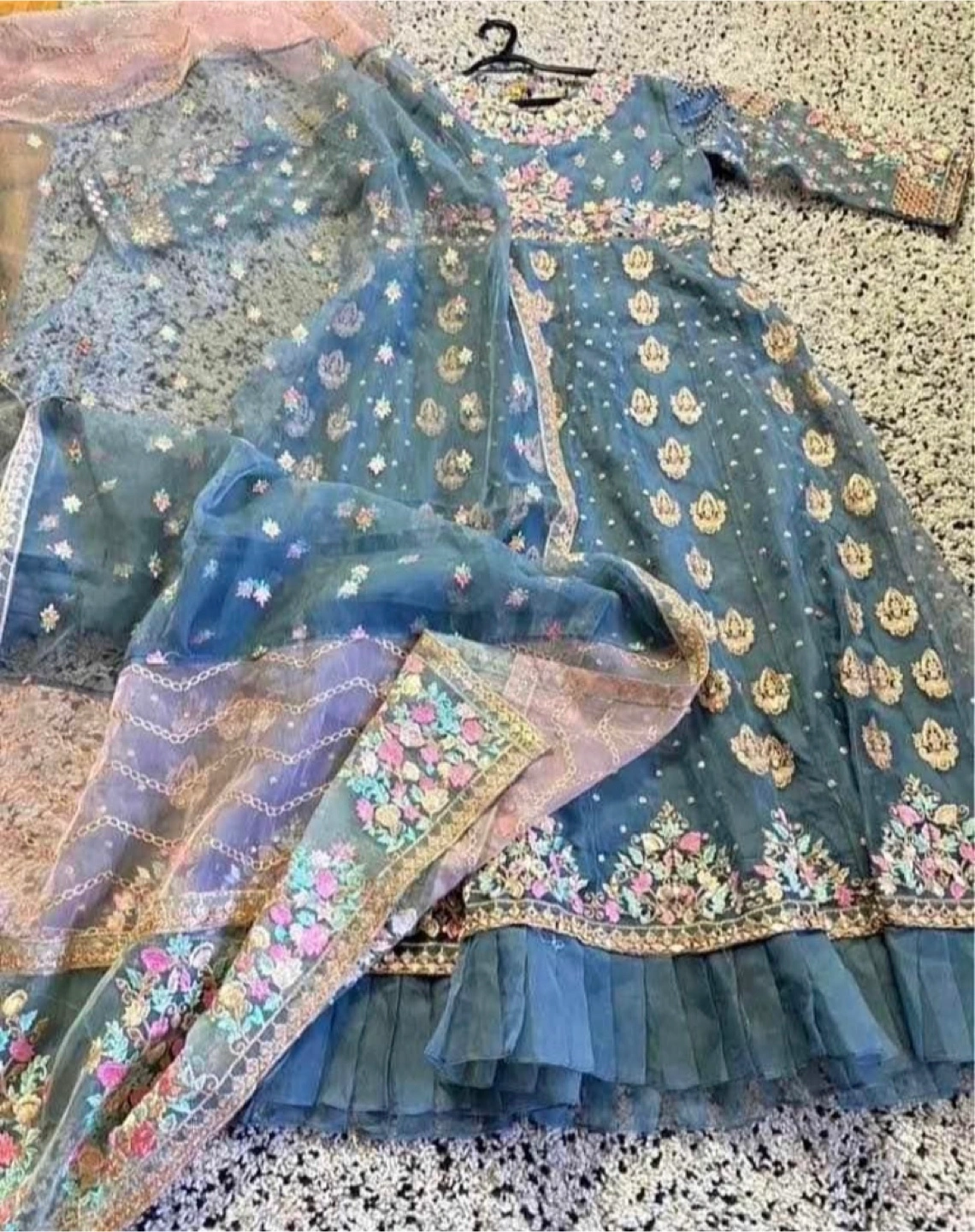 A stunning party wear dress. Long sleeves. The dress features intricate embroidery and beadwork. Includes a matching dupatta. You could wear this for a special occasion, and feel absolutely radiant.
