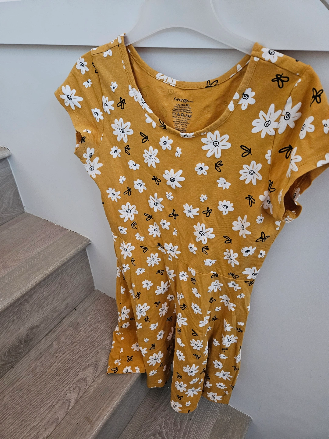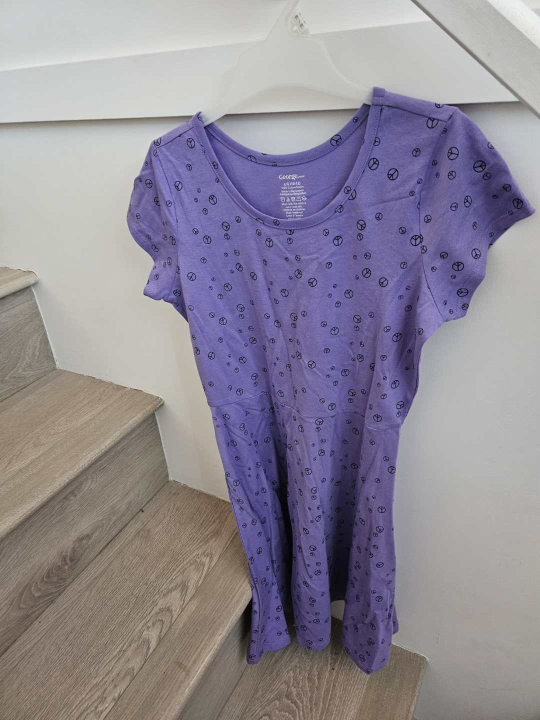 Two dresses with a fit and flare cut. One is mustard yellow with white flowers, the other is purple with peace symbols. They have a scoop neckline and short sleeves. A great choice for a summer day. Suitable for 10 - 12yr old.