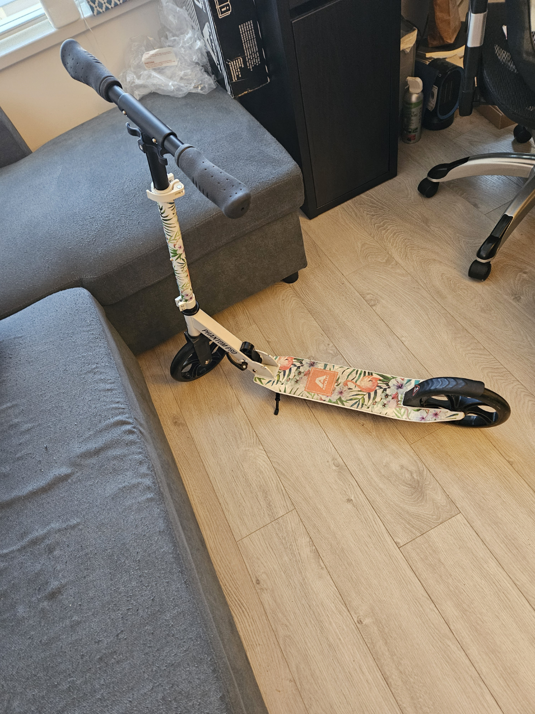 Features floral design elements. Black handlebars. A folding scooter, great for a scenic ride. Like new...kept in original box. Retail Price $95.