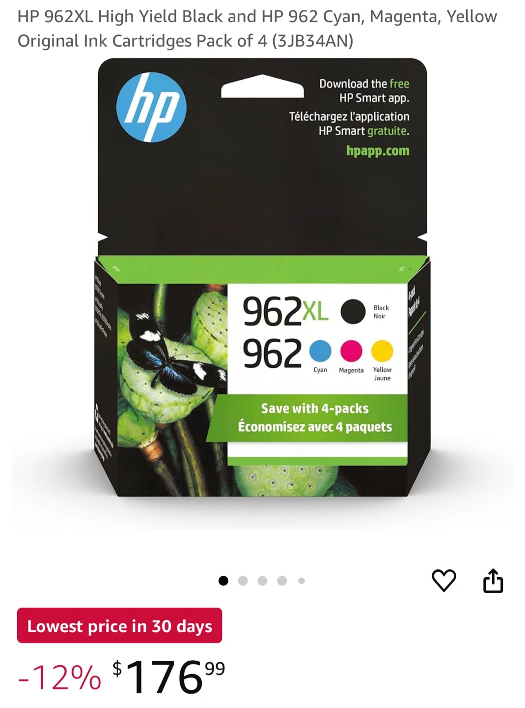 A set of ink cartridges. Includes different colours of ink. A great item to have on hand for when you need it.