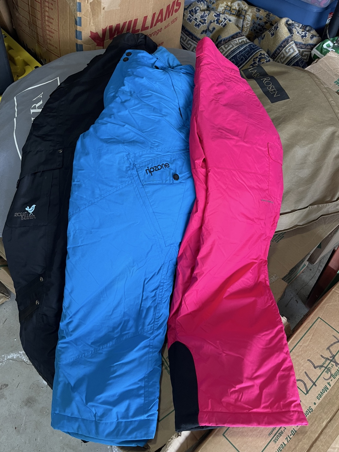 Snow pants in various colours. Two pairs from Ripzone, and one pair from Columbia. Perfect for winter activities.