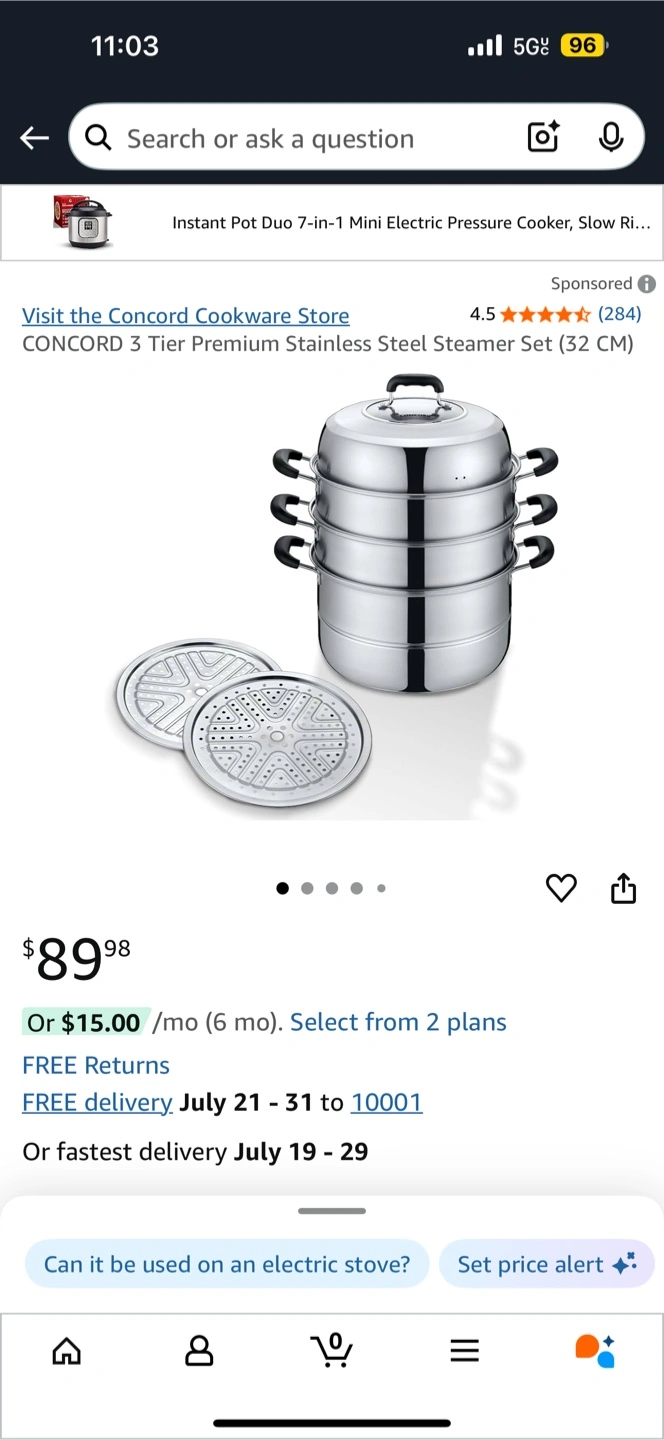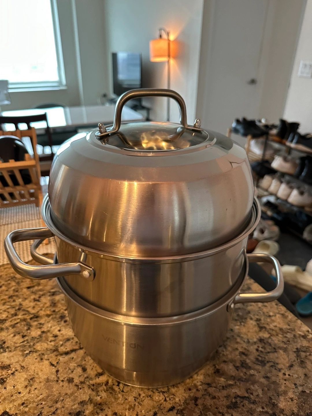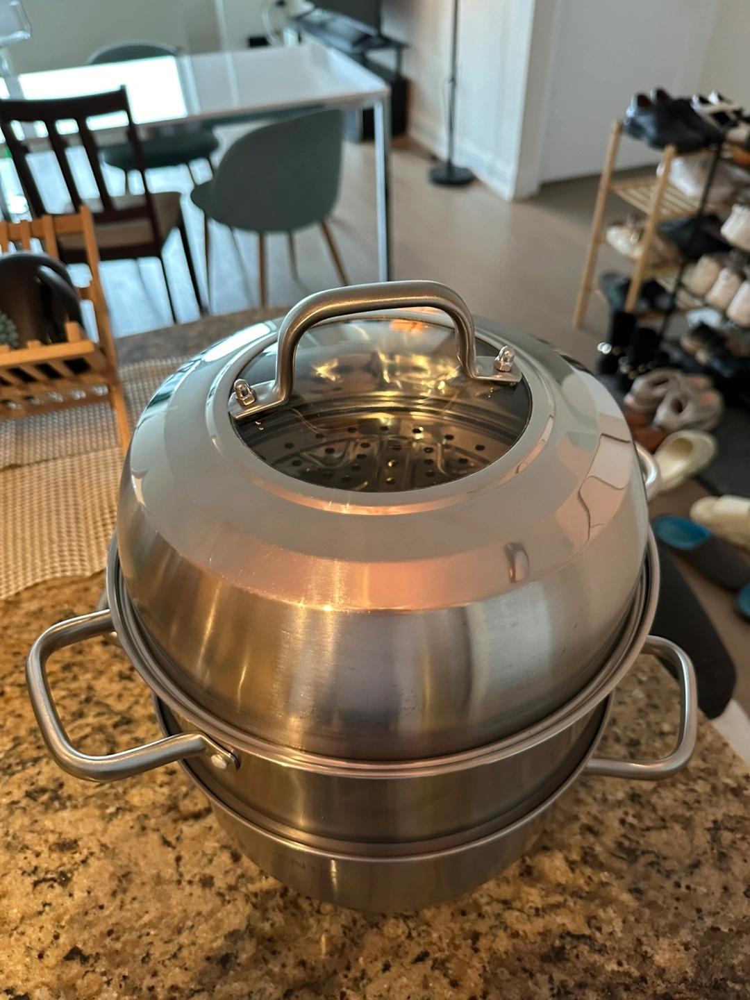 Stainless steel construction. Features a glass lid. Offers two tiers for steaming. Enjoy some delicious, healthy meals with this steamer set.