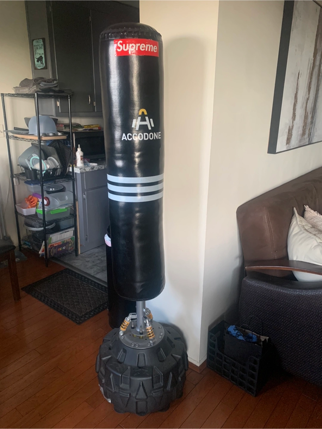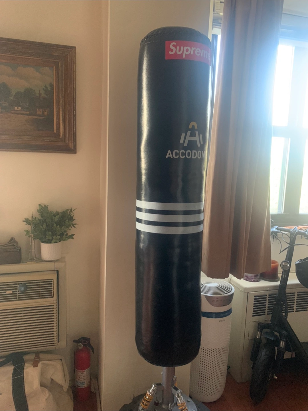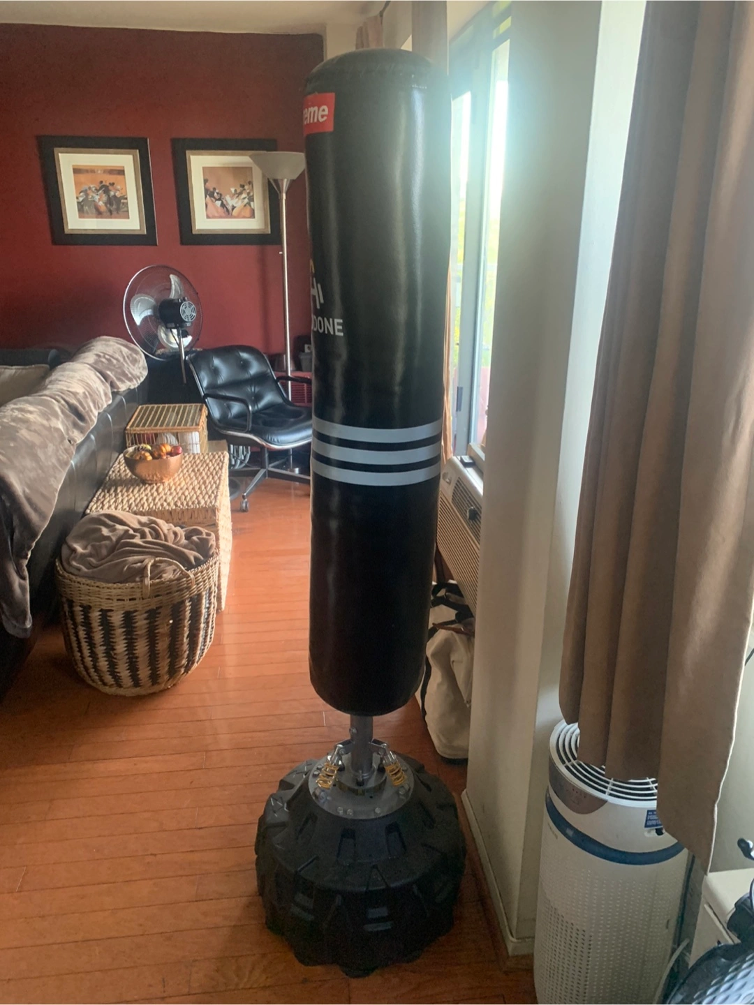 Sturdy black punching bag with a wide round base. The bag sits on a sturdy metal stand with yellow springs. Has multiple white stripes around the middle of the bag. (Supreme sticker is removable.) A great way to train or relieve some stress.