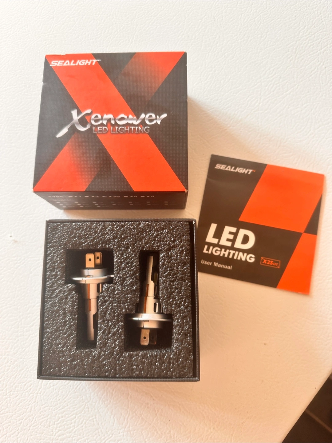 A headlight kit comes in its original packaging. Includes bulbs and a user manual. Imagine the relief of seeing clearly on a late night drive.
