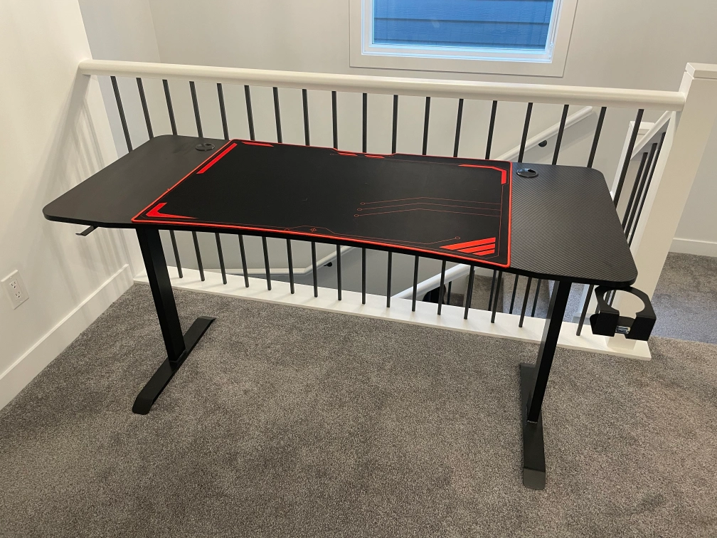 Black desk with red trim. Includes a cup holder and headphone hook. Has a mouse pad surface. A perfect place to unwind and immerse yourself in your favourite game or activity.