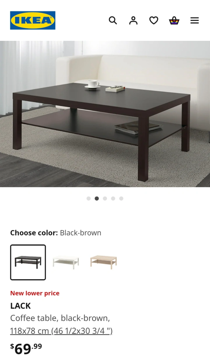 1 / 51 / 5Buy & SellIKEA LACK Coffee Table, Black-brownIKEA LACK Coffee Table, Black-brown$44Rectangular table. Dark colour with a lower shelf. A wonderful place to set a tray and share a cup of tea.ConditionGoodDimensions118x78 cm (46 1/2x30 3/4 ")WHERE TO MEETGoose Island BreweryView MapSELLERverifiedPriyankaDowntown Toronto1598 reviews1 chats·0 favorites·29 viewsSEND CHAT TO SELLERHi Priyanka! I’m interested in your listing.Hi Priyanka! I’m interested in your listing.Get the Karrot app to chatSign In to chat