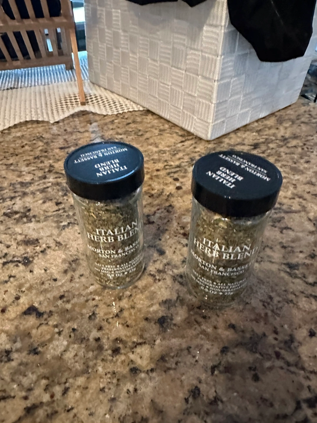 Two glass jars. Containing an Italian herb blend. The jars have black lids. The herbs can add flavor to a wide range of dishes, bringing a touch of peace to your cooking routine.