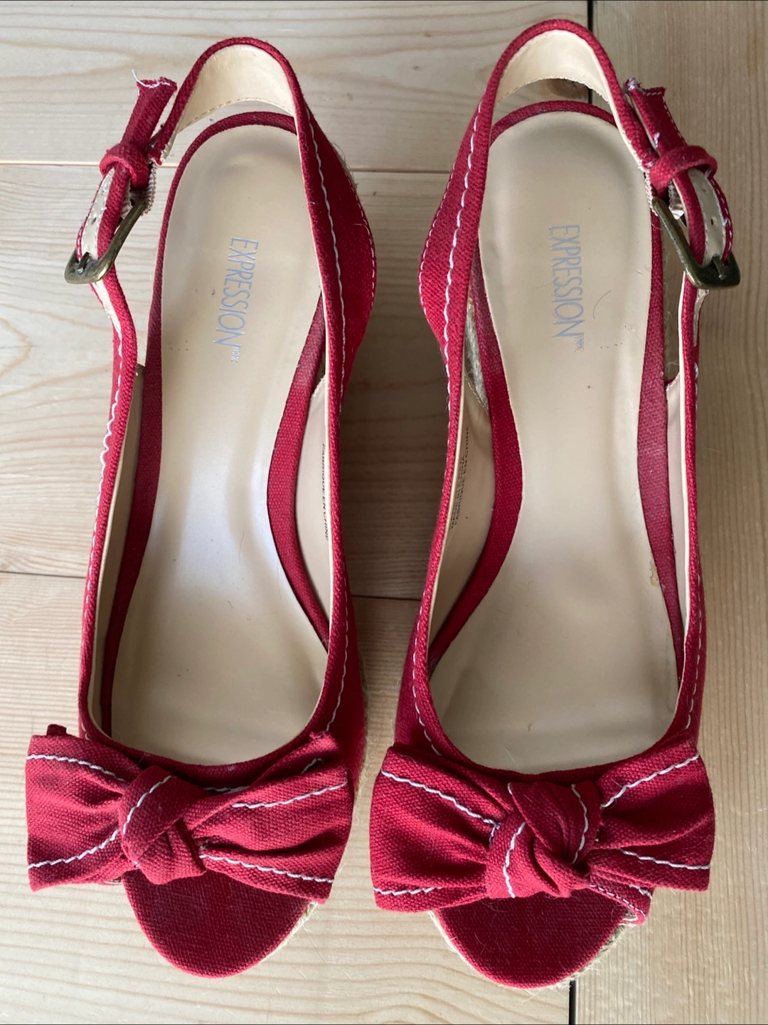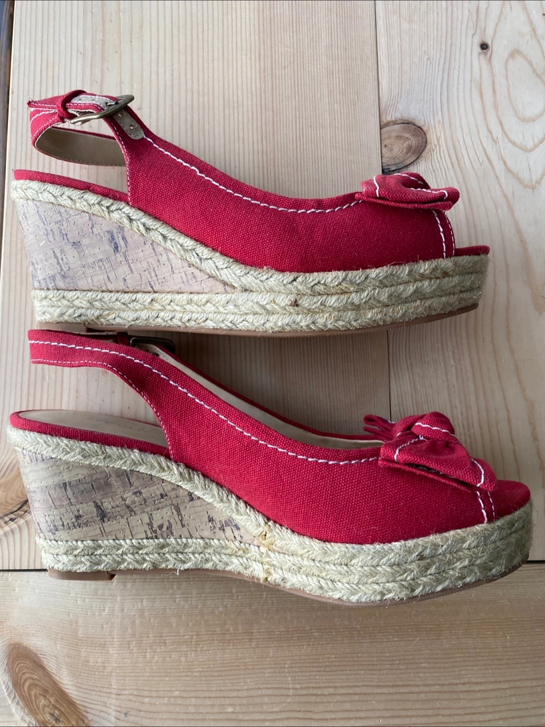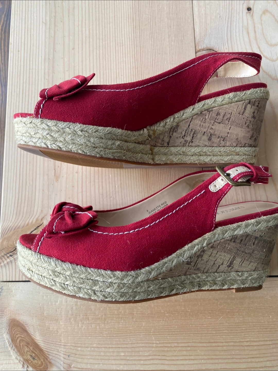 Red espadrille sandals. White stitching detail. Features a bow accent. Perfect for a summer day out, providing both comfort and style.