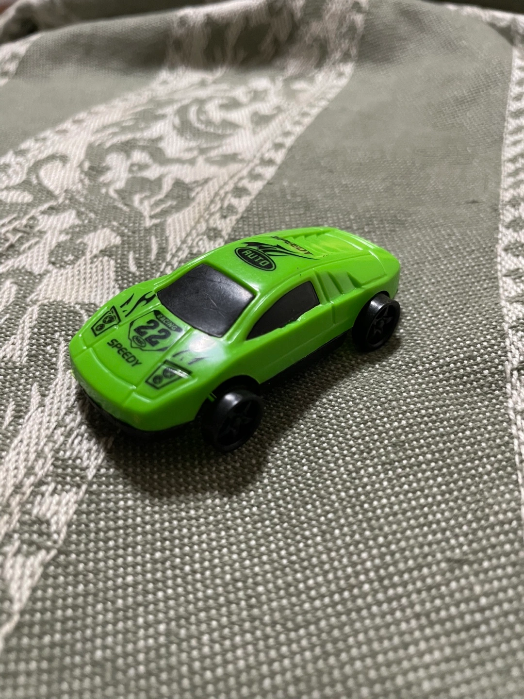 Bright green car. Black wheels. Racing details on the hood. A fun item for kids to play with and imagine new adventures.