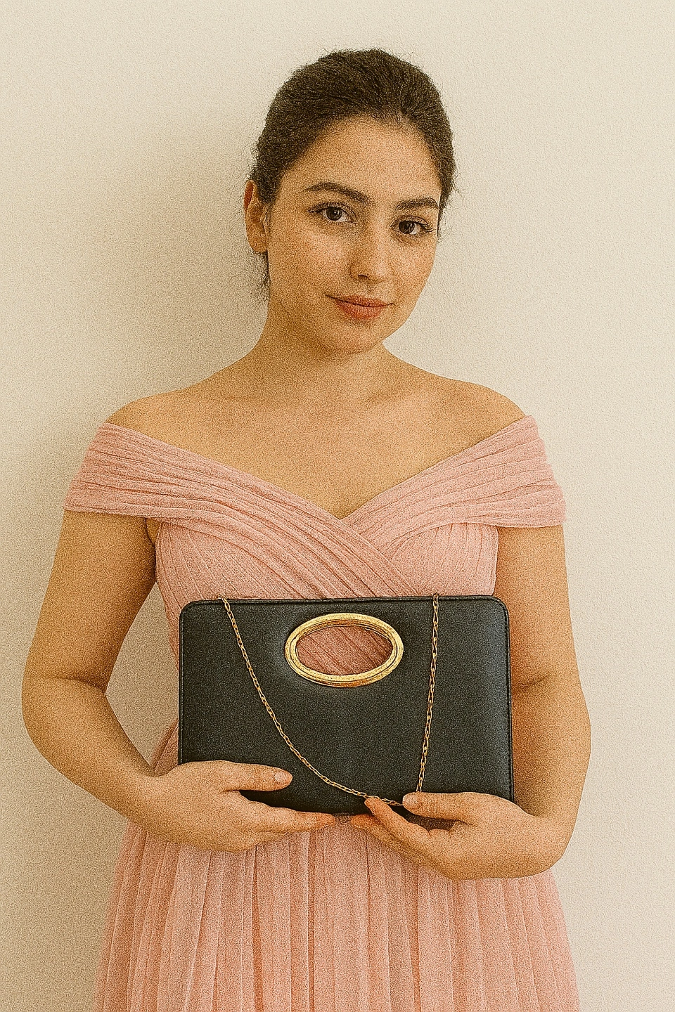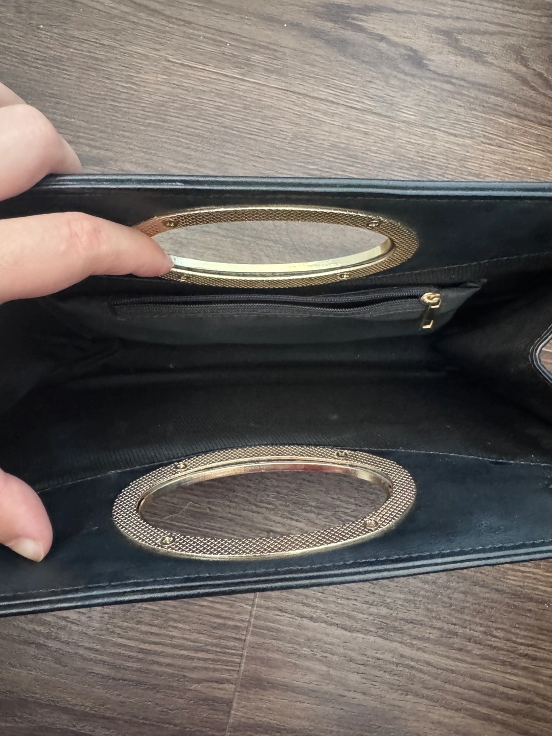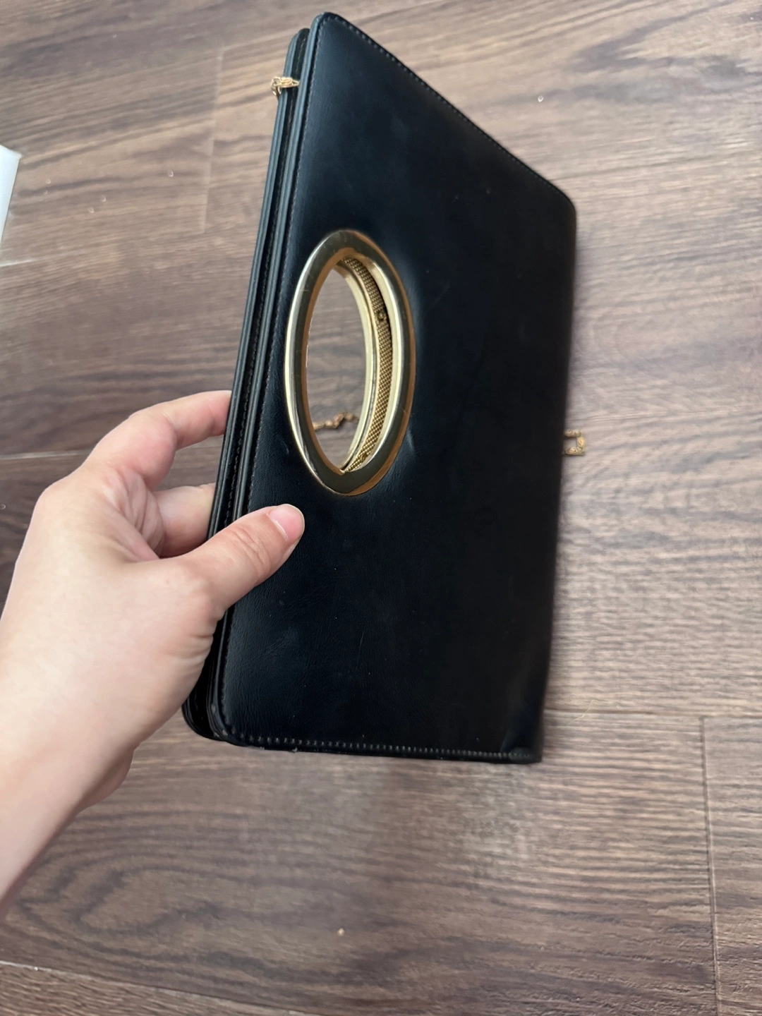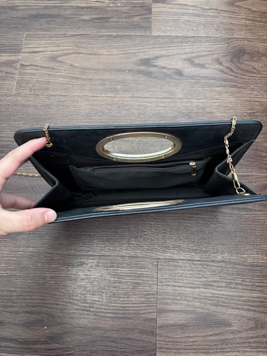 628Black clutch purse with gold chain strap. Features an oval, metallic handle. Inside, a small zipper pocket can be found. With this purse, you can keep your essentials close at hand. Pick up Yonge and Davisville