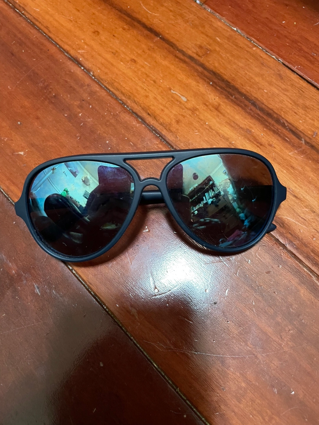 Small black sunglasses with dark lenses. Frames in a small classic aviator style. Perfect for a sunny day stroll or a relaxing moment outdoors.