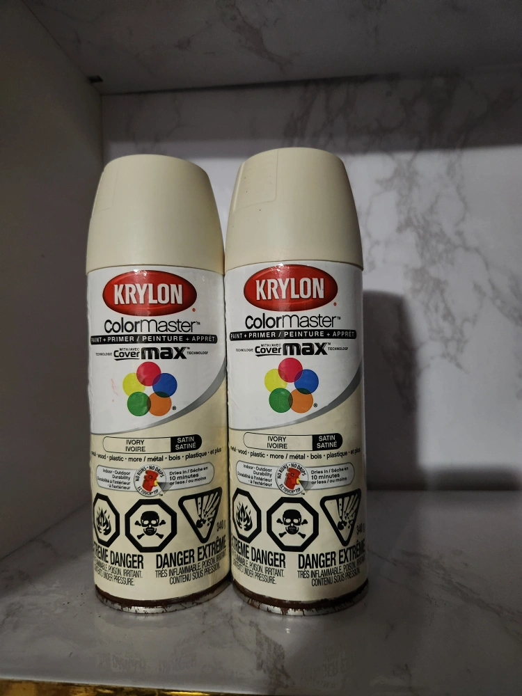 Several cans of spray paint. The colours include Almond, Ivory, and Rich Plum. The paint can be used on wood, plastic, and metal. Using this spray paint will surely turn any project into a satisfying activity.