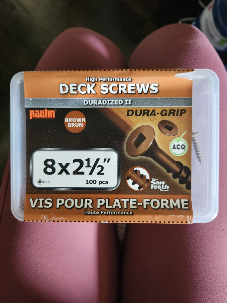 Deck screws. Brown in colour. Rectangular head style. Packaging with a clear container. Can be used for building projects, with a meditative aspect.