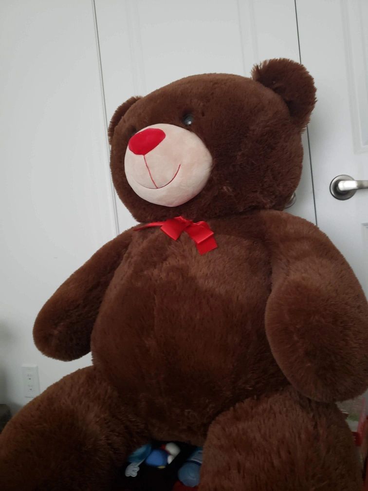 1000+Brown plush teddy bear. Red bow tied around the neck. Large size. A fantastic companion for cuddles and relaxation.