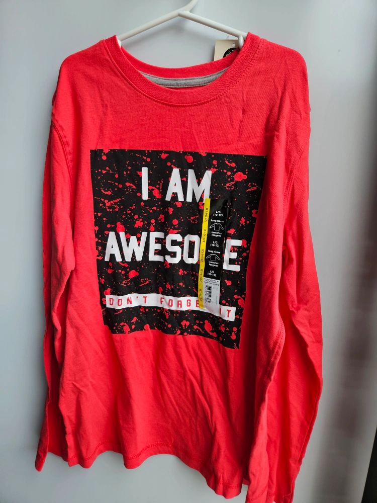 Bright red long-sleeve shirt. Bold white lettering with black splatter design. "I am awesome" is printed on the front. Great for staying cozy on chilly days.