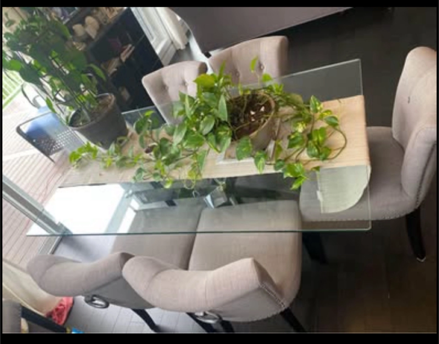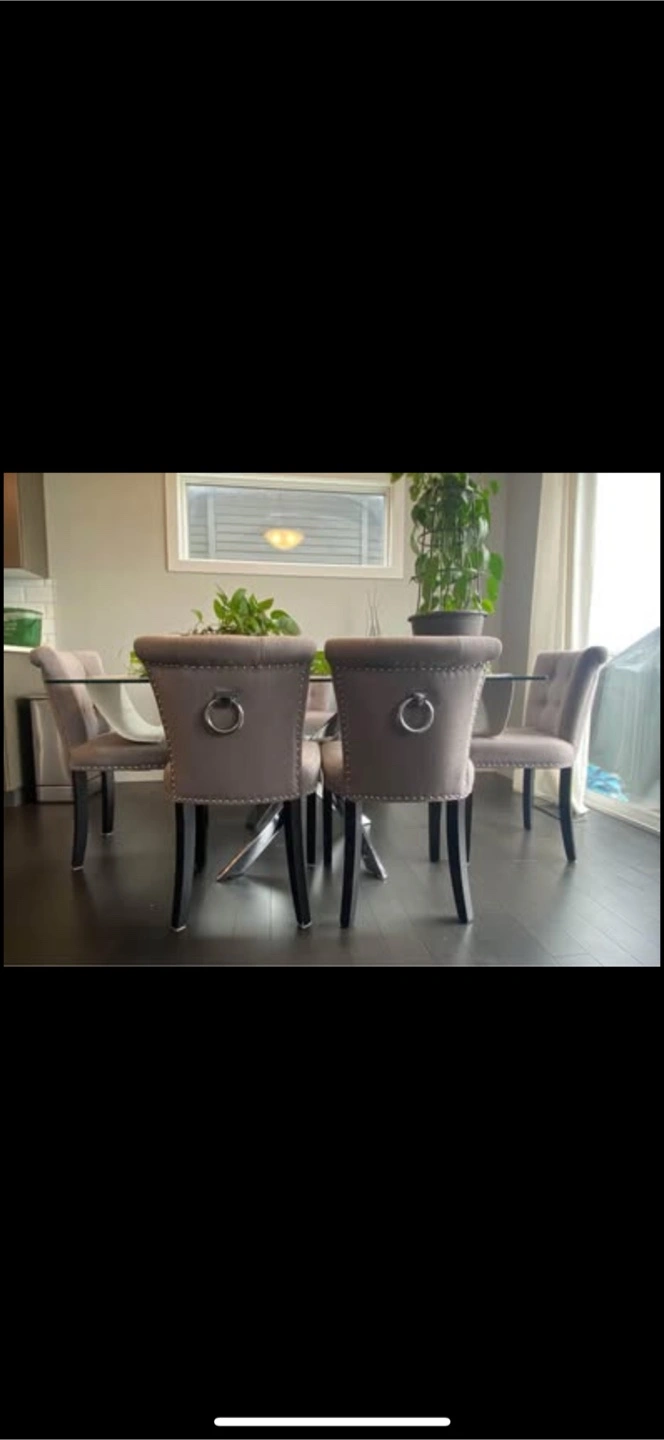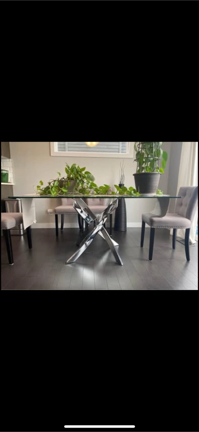 Dining table with a glass top. Features a unique metal base. This table is the perfect spot to gather with loved ones and share a meal. Includes six purple dining room chairs.