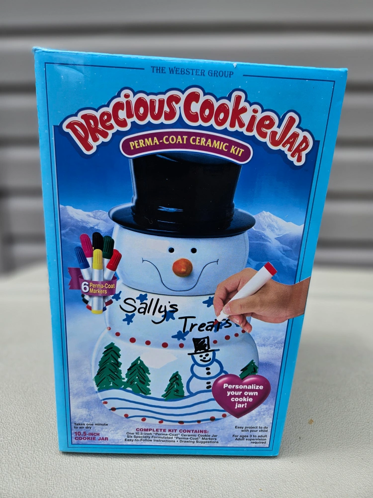 A ceramic cookie jar kit featuring a snowman design. Includes a ceramic cookie jar and markers. A fun and relaxing project for all ages to enjoy.