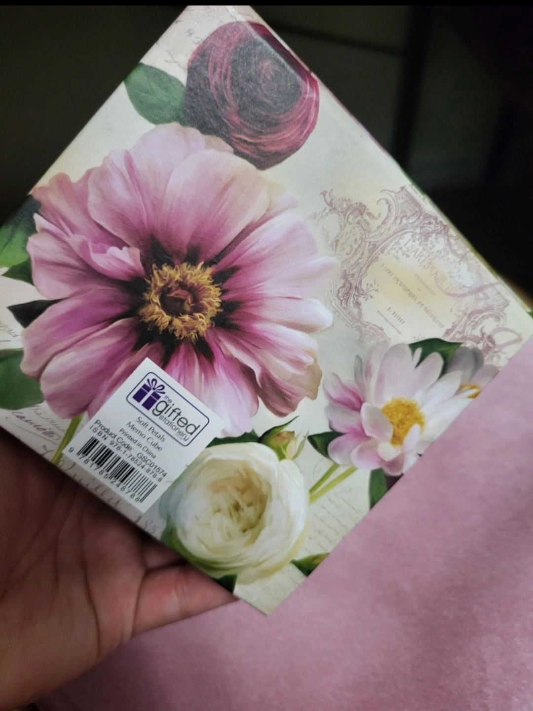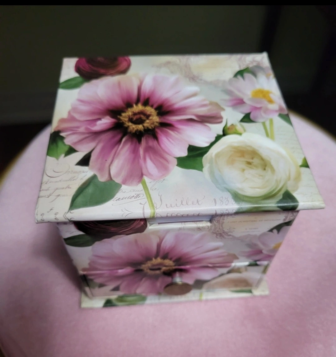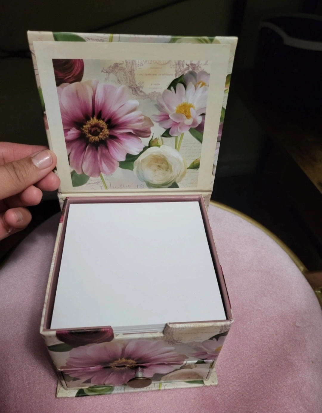 Cube shaped item with floral patterns. Features a drawer with a knob. The item also contains a square compartment, likely for memo pads. It would be a great spot to store all sorts of little trinkets to keep your space organized.