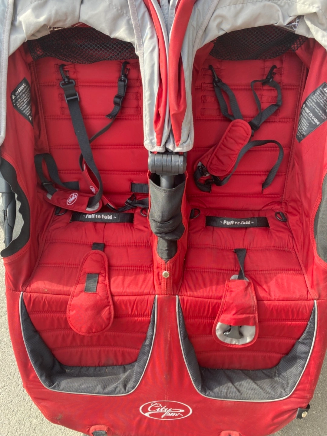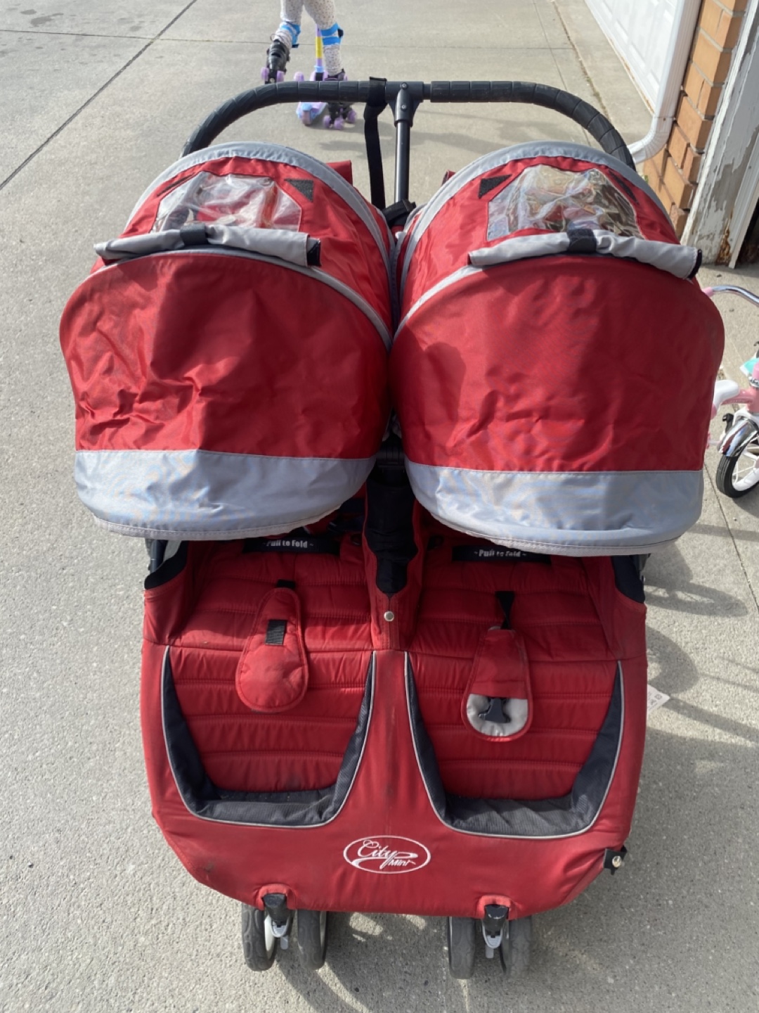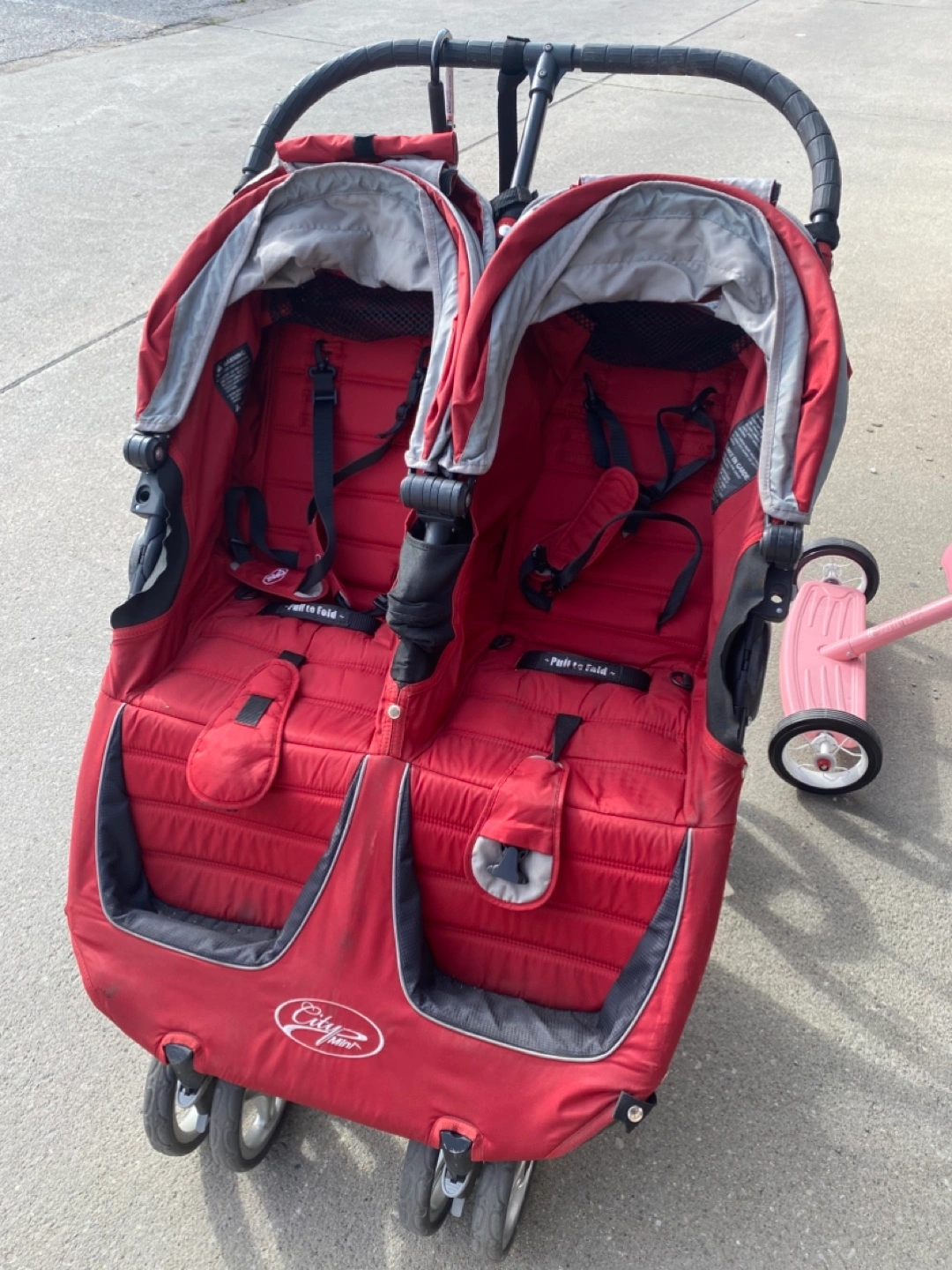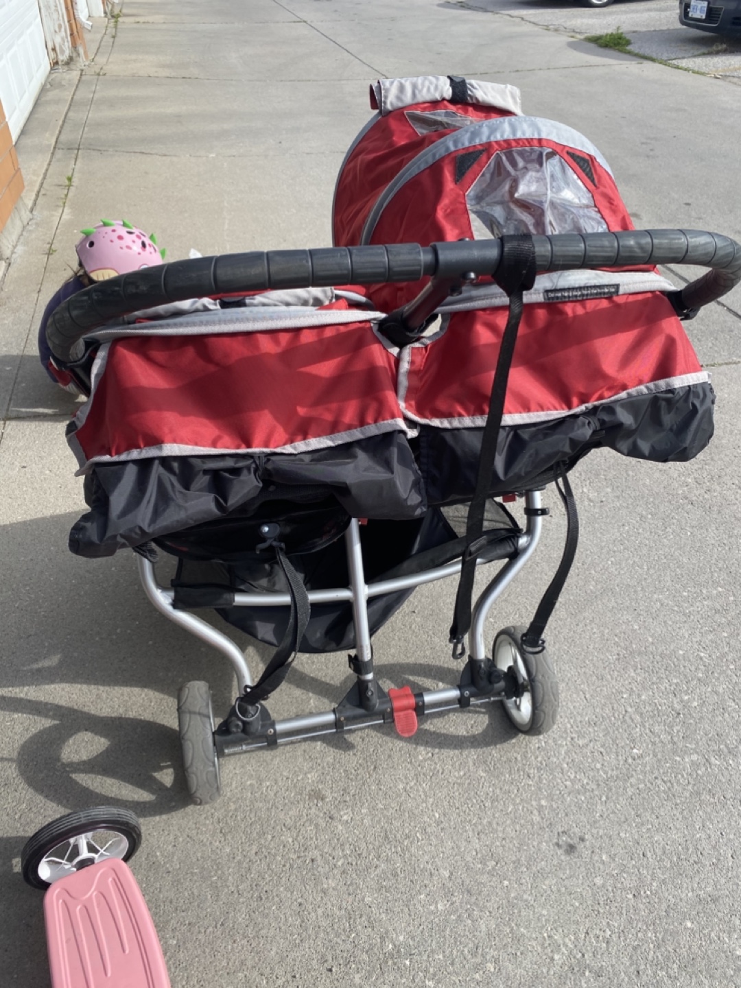 A used but good condition red double stroller. The stroller has been stored indoors and previously had seat covers so the seat is very clean.