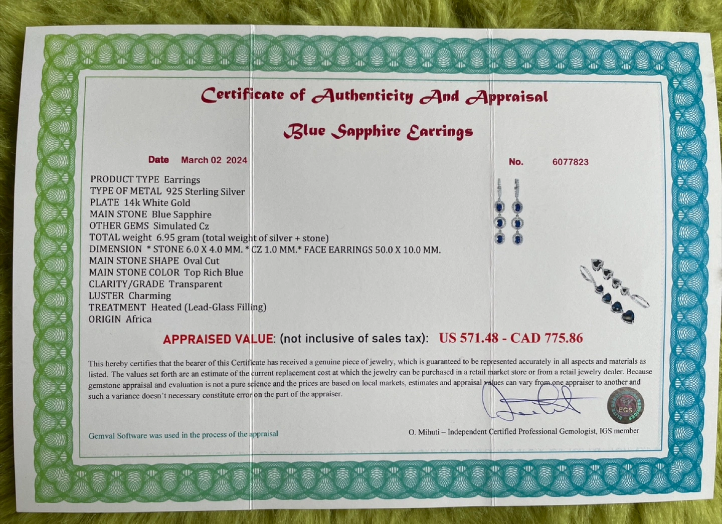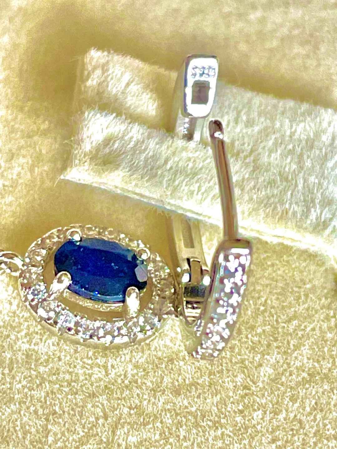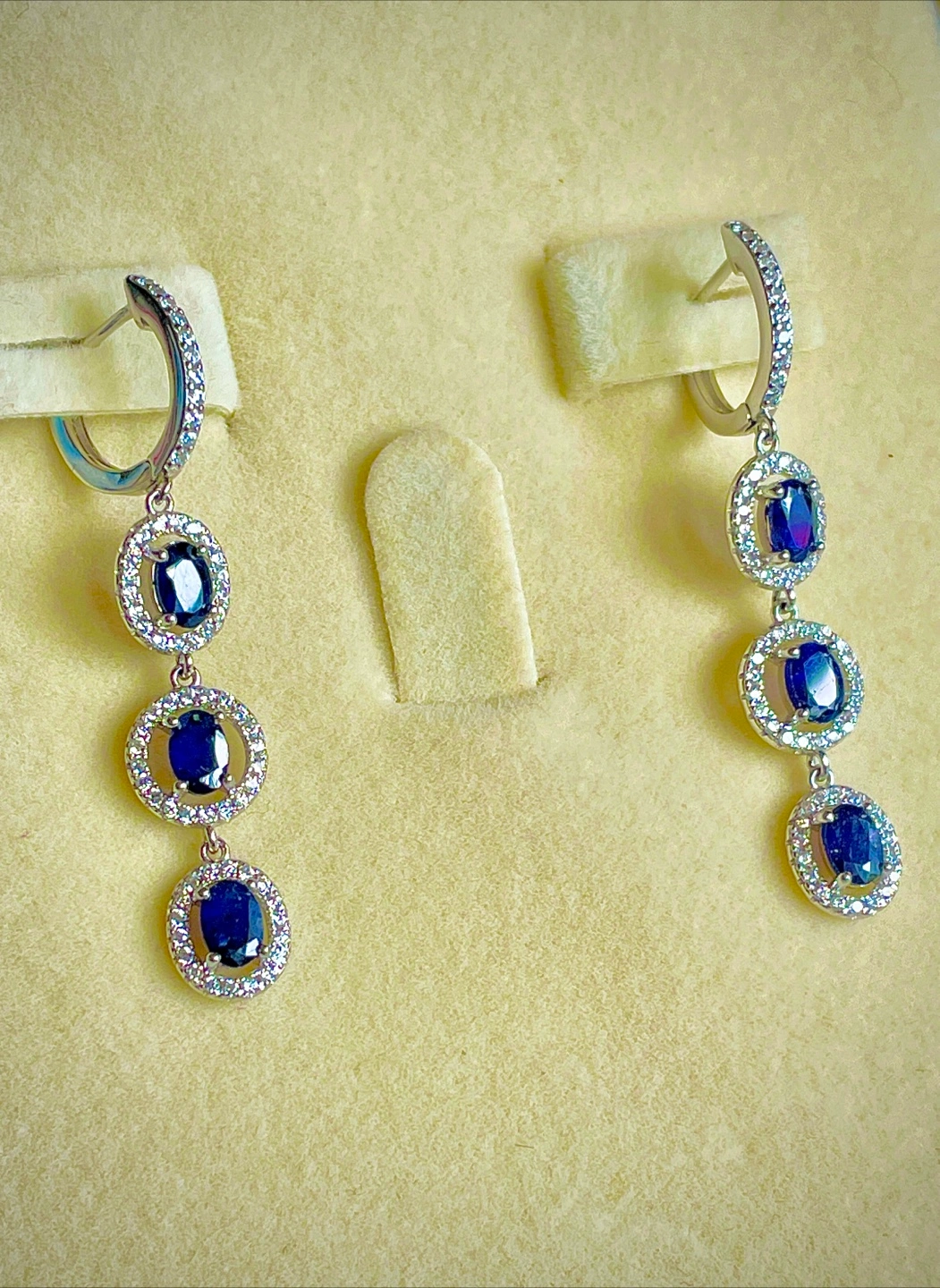 Hanging Earrings about 5 cm featuring with 6 oval Blue Sapphire Each stone surrounded by small Cz.