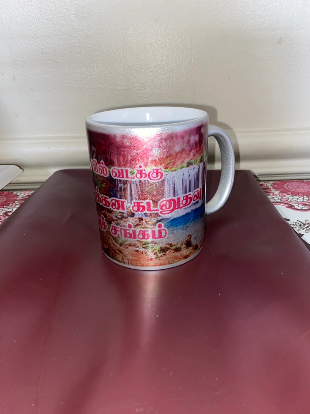 215A ceramic mug. Features a silver handle. Has colourful design all over it. It is great for enjoying your favourite hot beverage.